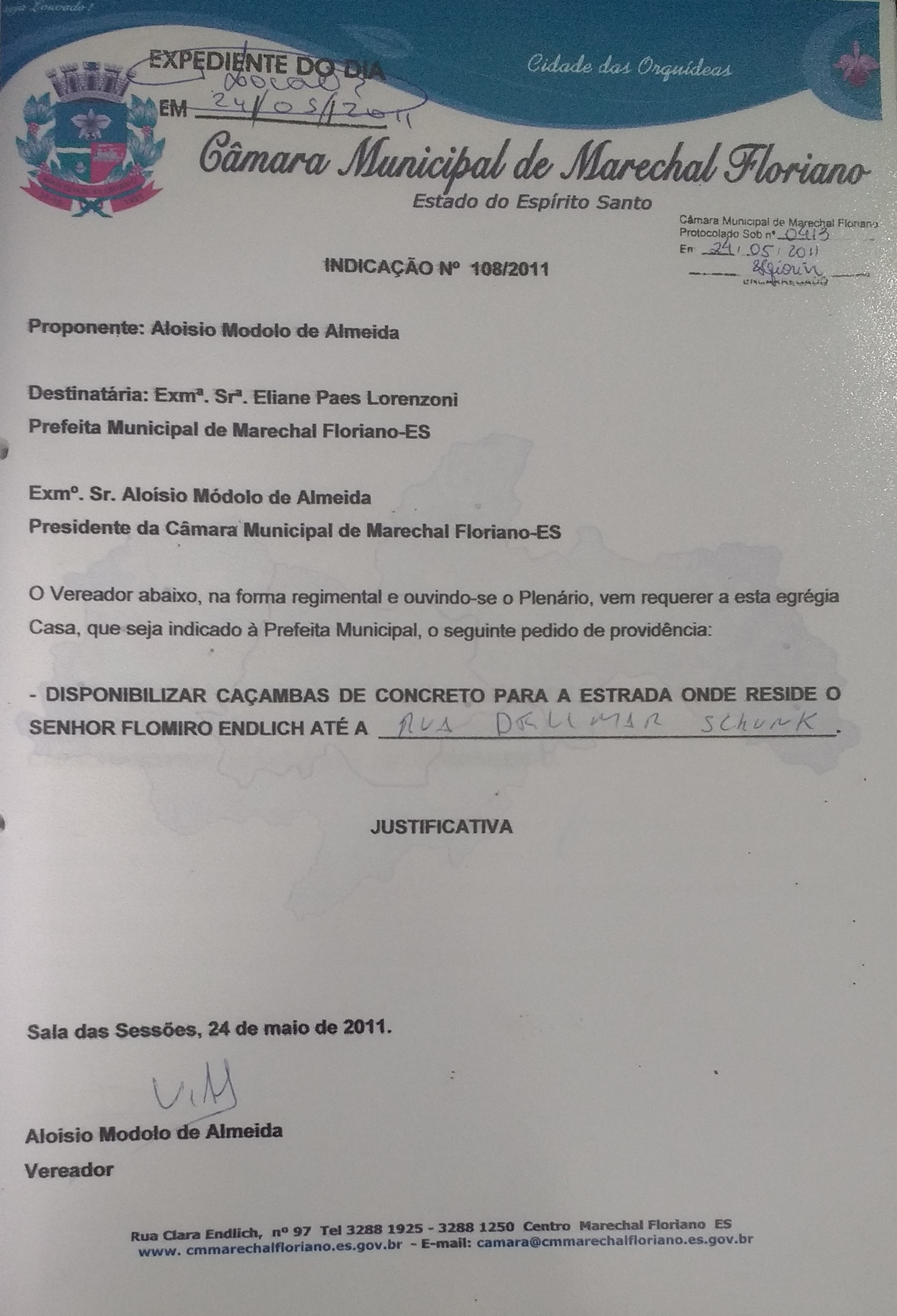 Ementa: DISPONIBILIZAR CAÇAMBAS DE CONCRETO PARA A ESTRADA ONDE RESIDE O SENHOR FLOMIRO ENCLICH ATÉ A RUA DELIMAR SCHUNCK.