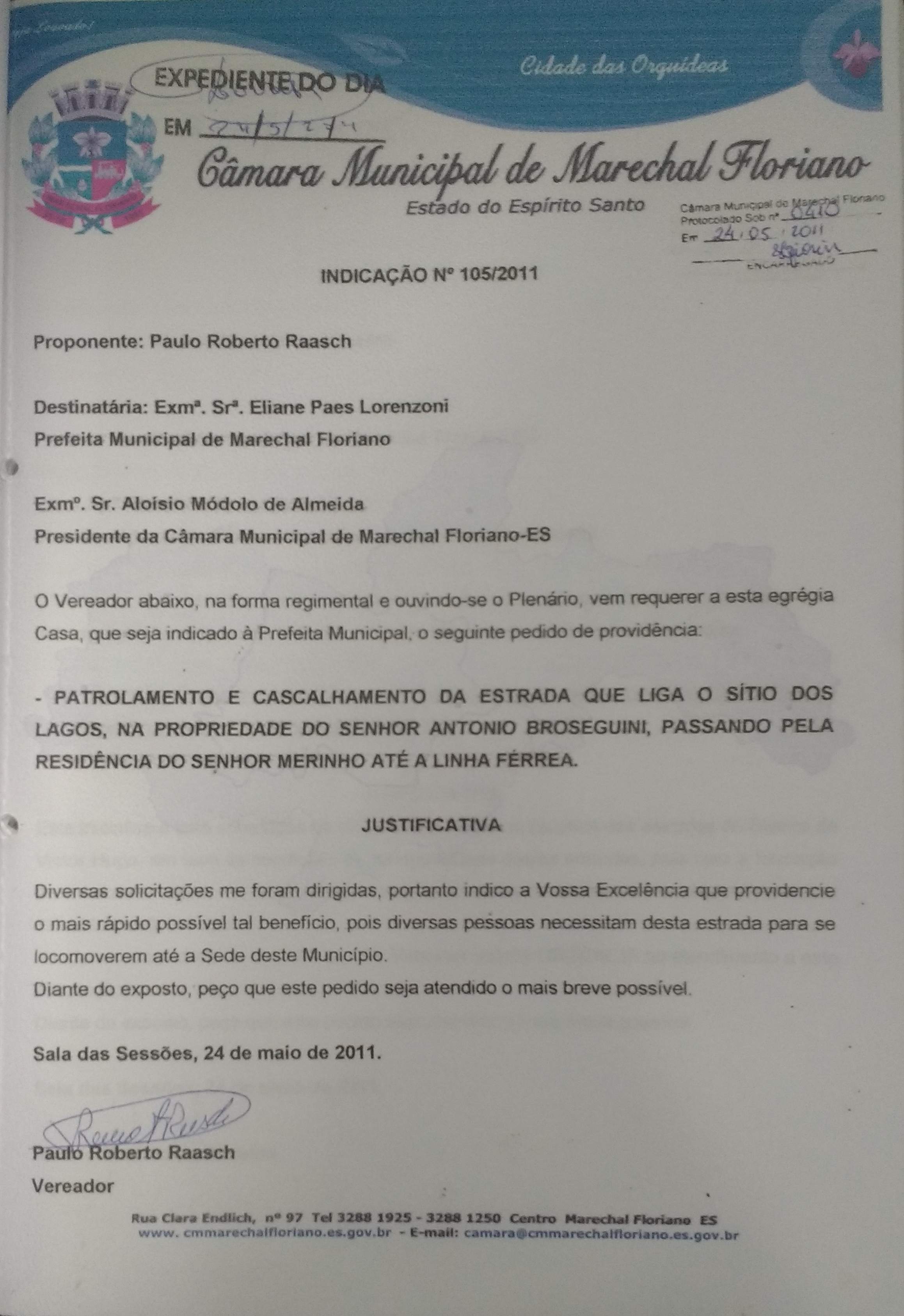 Ementa: PATROLAMENTO E CASCALHAMENTO DA ESTRADA QUE LIGA O SITIO DOS LAGOS, NA PROPRIEDADE DO SENHOR ANTONIO BROSEGUINI, PASSANDO PELA RESIDÊNCIA DO SENHOR MERINHO ATÉ A LINHA FÉRREA.