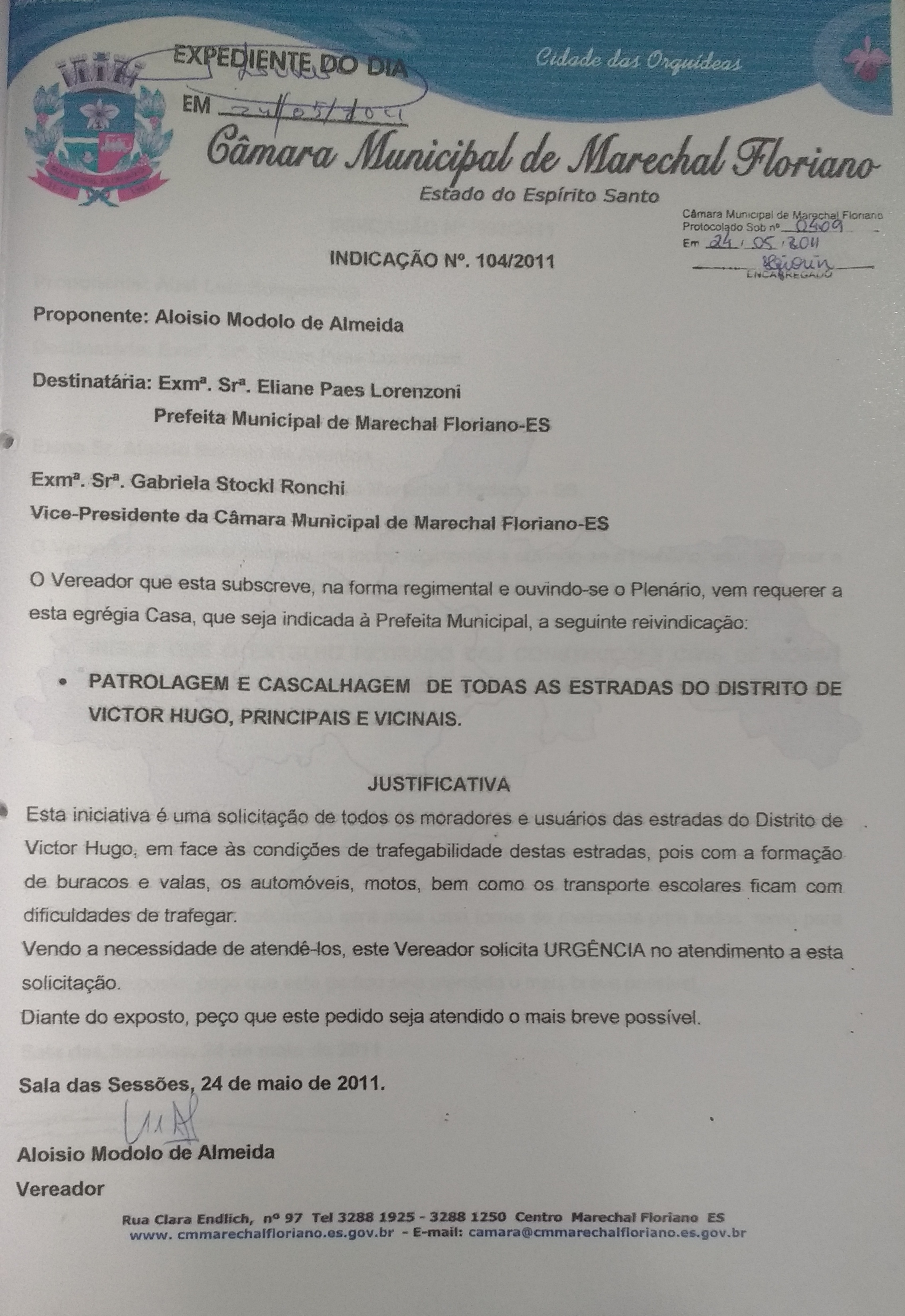 Ementa: PATROLAGEM E CASCALHAGEM DE TODAS AS ESTRADAS DO DISTRITO DE VICTOR HUGO, PRINCIPAIS E VICINAIS.