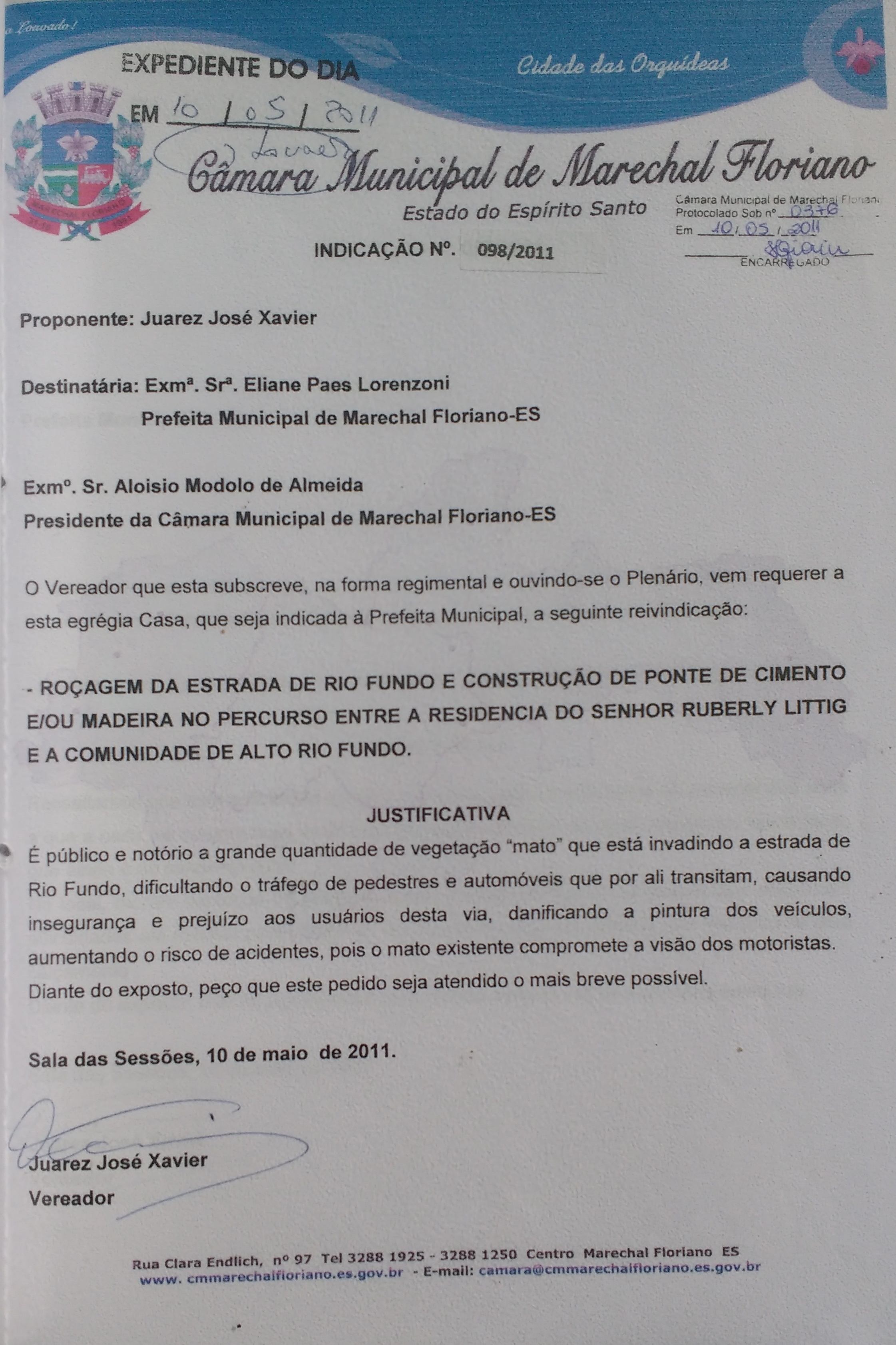 Ementa: ROÇAGEM DA ESTRADA DE RIO FUNDO E CONSTRUÇÃO DE PONTE DE CIMENTO E/OU MADEIRA NO PERCURSO ENTRE A RESIDENCIA DO SENHOR RUBERLY LITTIG E A COMUNIDADE DE ALTO RIO FUNDO.