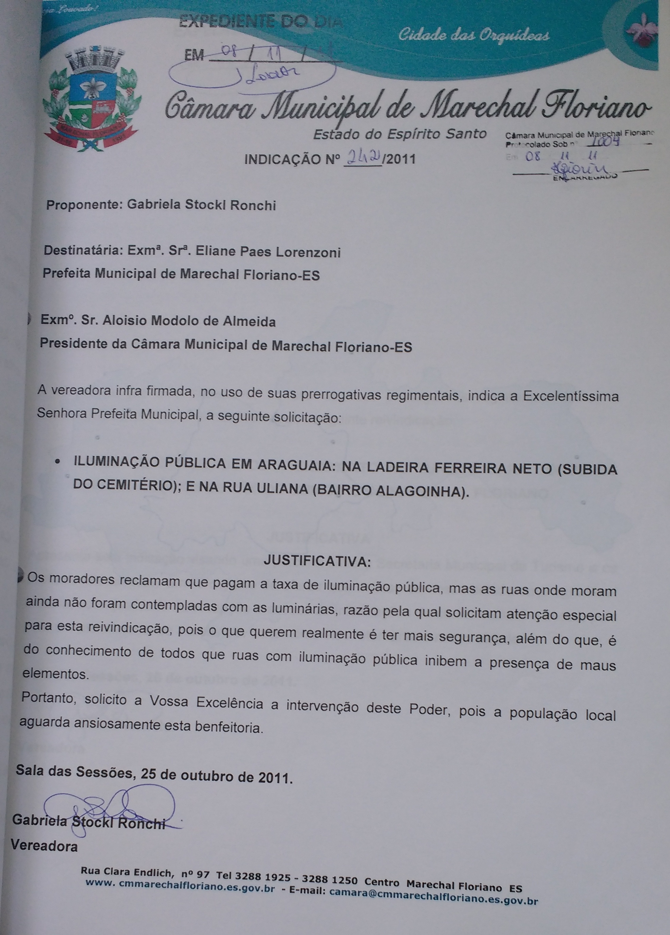 Ementa: ILUMINAÇÃO PÚBLICA EM ARAGUAIA: NA LADEIRA FERREIRA NETO (SUBIDA DO CEMITÉRIO); E NA RUA ULIANA (BAIRRO ALAGOINHA).