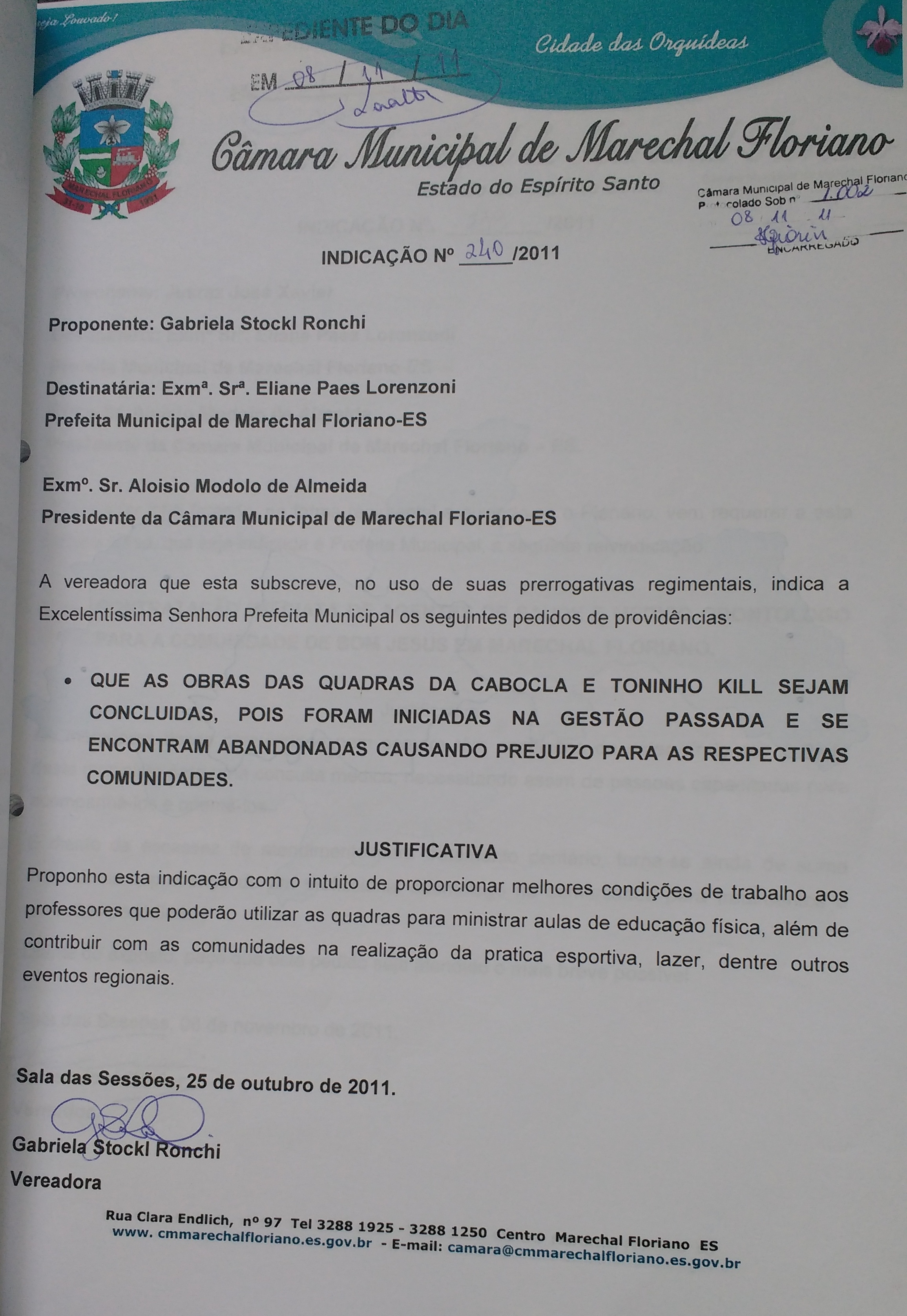 Ementa: QUE AS OBRAS DAS QUADRAS DA CABOCLA E TONINHO KILL SEJAM CONCLUÍDAS, POIS FORAM INICIADAS NA GESTÃO PASSADA E SE ENCONTRAM ABANDONADAS CAUSANDO PREJUÍZO PARA AS RESPECTIVAS COMUNIDADES.
