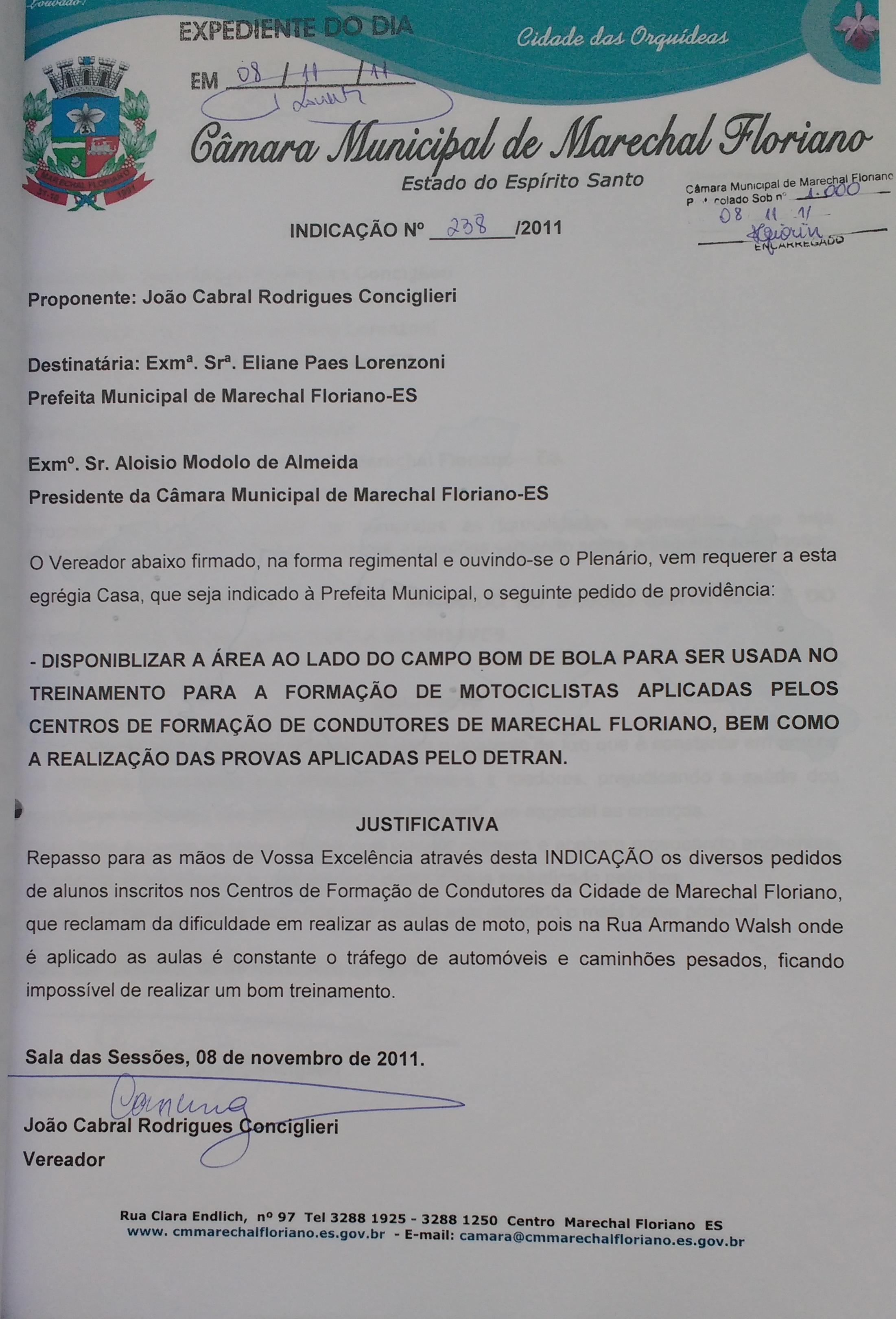 Ementa: DISPONIBILIZAR A ÁREA AO LADO DO CAMPO BOM DE BOLA PARA SER USADA NO TREINAMENTO PARA A FORMAÇÃO DE MOTOCICLISTAS APLICADAS PELOS CENTROS DE FORMAÇÃO DE CONDUTORES DE MARECHAL FLORIANO, BEM COMO A REALIZAÇÃO DAS PROVAS APLICADAS PELO DETRAN.