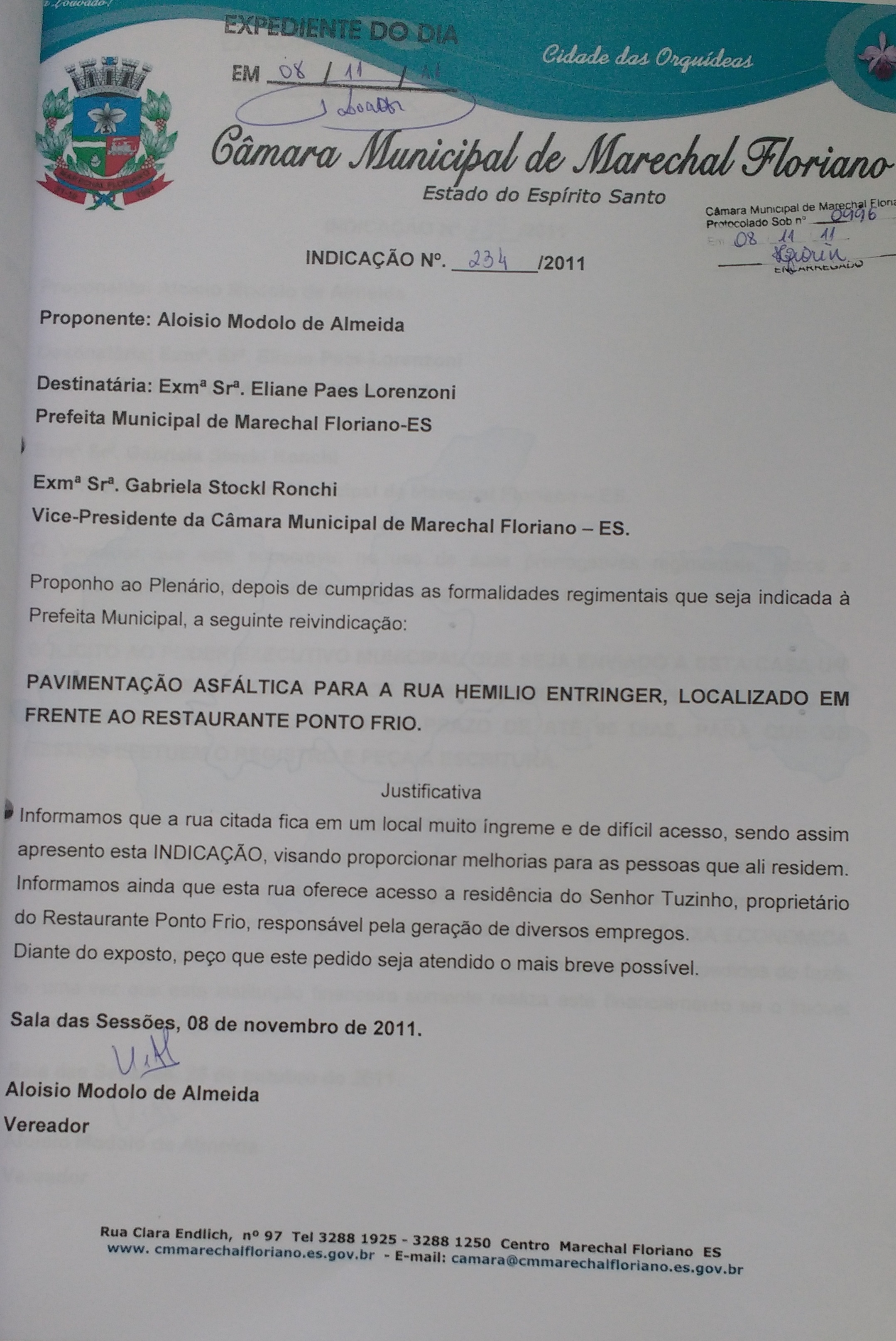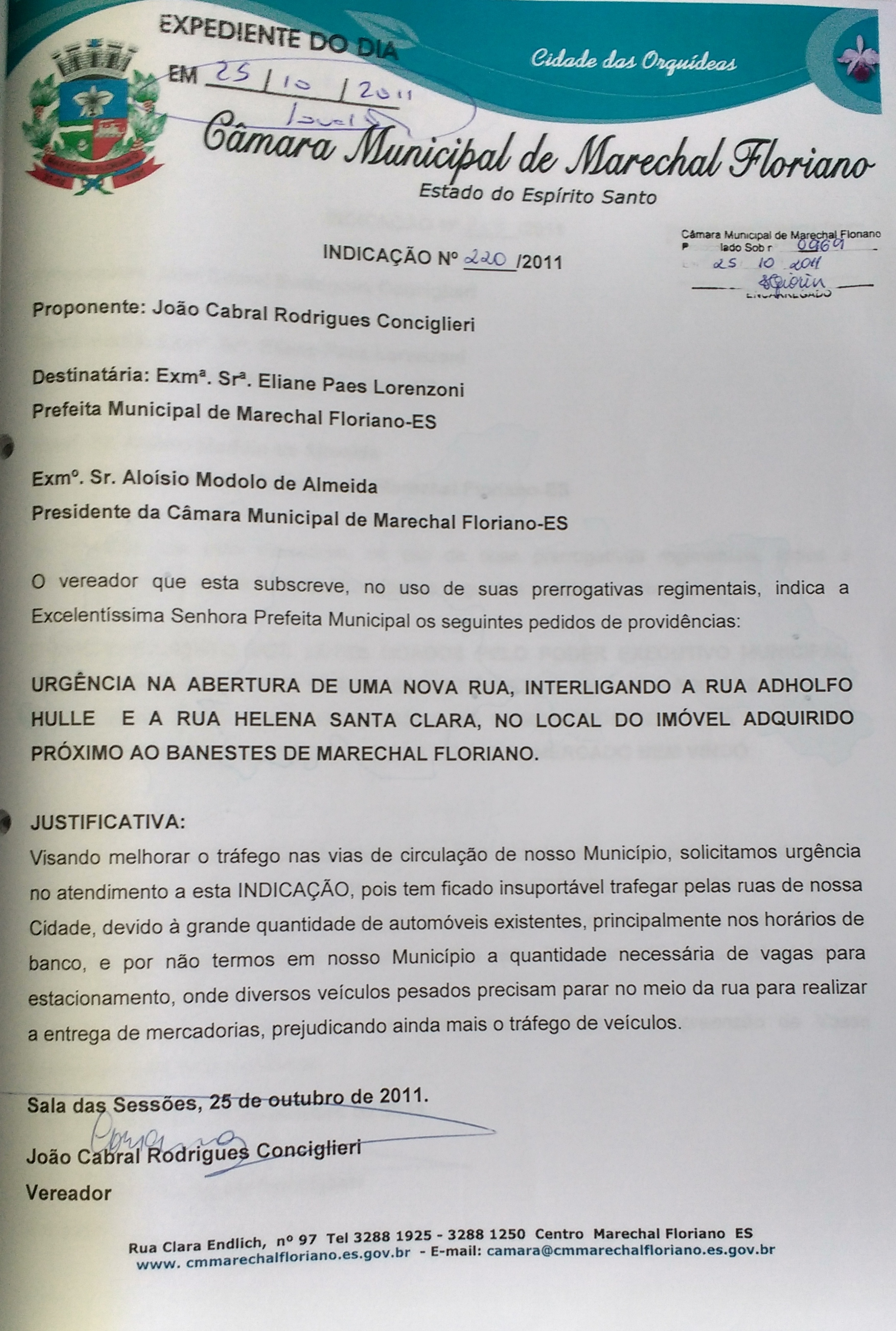 Ementa: URGÊNCIA NA ABERTURA DE UMA NOVA RUA, INTERLIGANDO A RUA ADHOLFO HULLE E A RUA HELENA SANTA CLARA, NO LOCAL DO IMÓVEL ADQUIRIDO PRÓXIMO AO BANESTES DE MARECHAL FLORIANO.