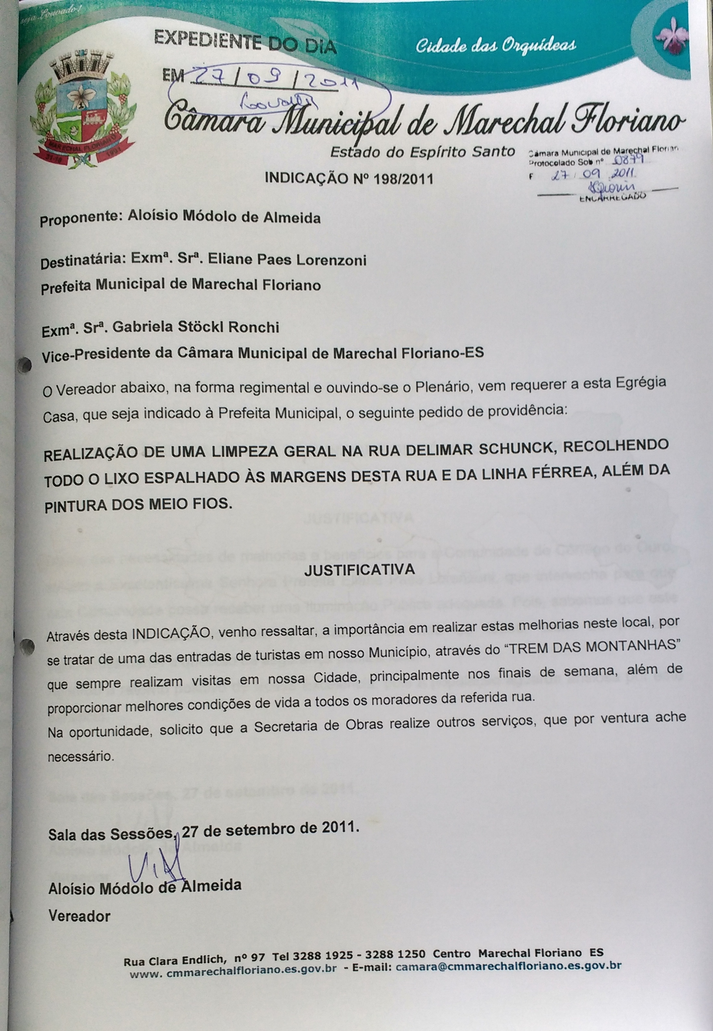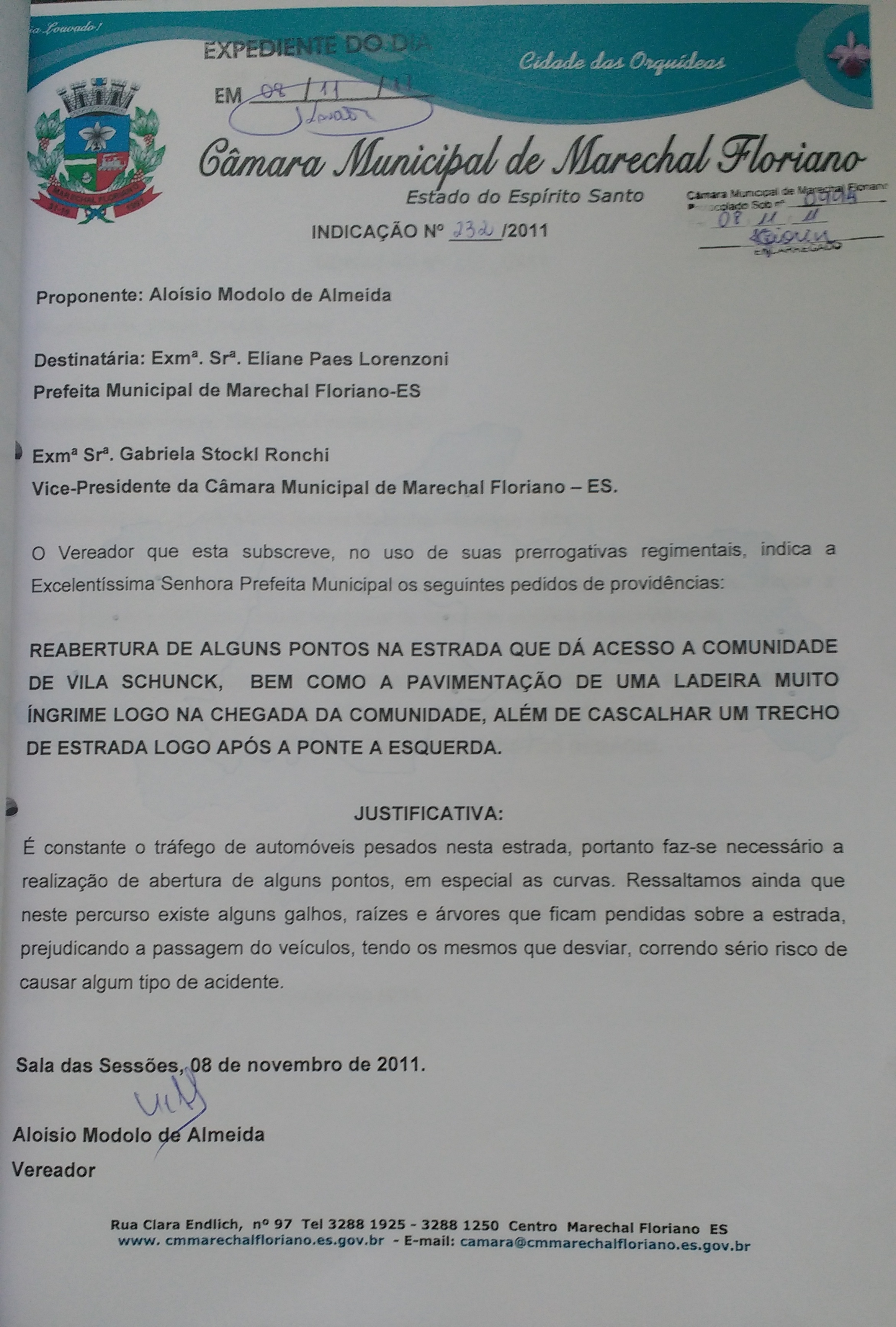 Ementa: REABERTURA DE ALGUNS PONTOS NA ESTRADA QUE DÁ ACESSO A COMUNIDADE DE VILA SCHUNCK, BEM COMO A PAVIMENTAÇÃO DE UMA LADEIRA MUITO INGRIME LOGO NA CHEGADA DA COMUNIDADE, ALÉM DE CASCALHAR UM TRECHO DE ESTRADA LOGO APÓS A PONTE A ESQUERDA.