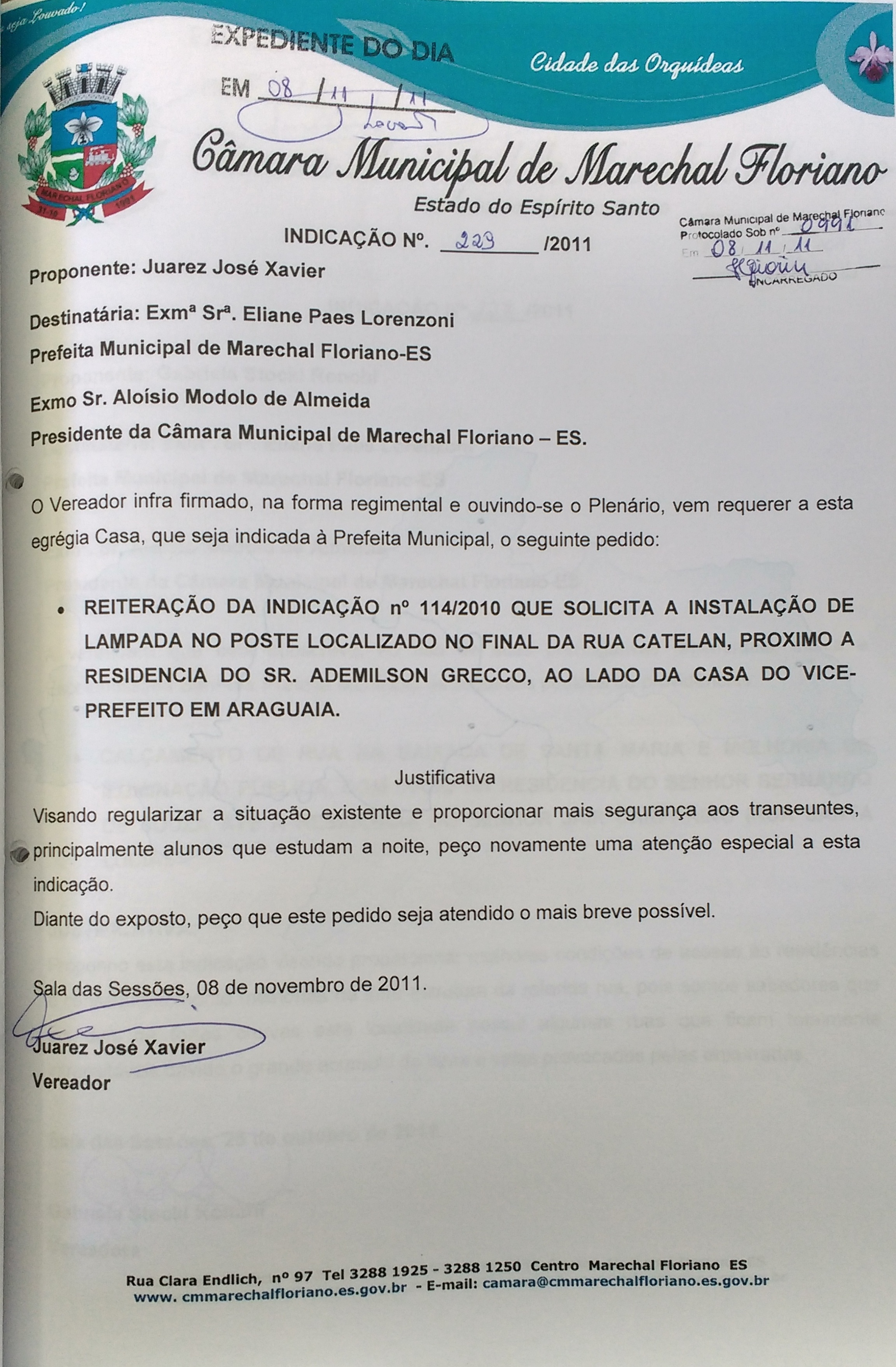 Ementa: REITERAÇÃO DA INDICAÇÃO N°114/2010 QUE SOLICITA A INSTALAÇÃO DE LAMPADA NO POSTE LOCALIZADO NO FINAL DA RUA CATELAN, PRÓXIMO A RESIDENCIA DO SR. ADEMILSON GRECCO, AO LADO DA CASA DO VICE-PREFEITO EM ARAGUAIA.