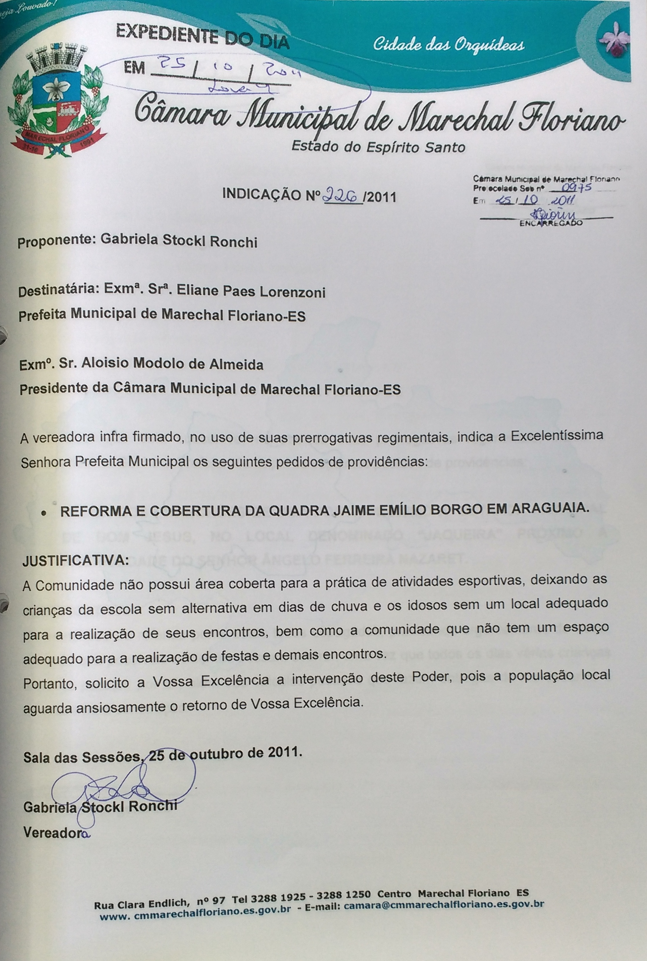 Ementa: REFORMA E COBERTURA DA QUADRA JAIME EMÍLIO BORGO EM ARAGUAIA.