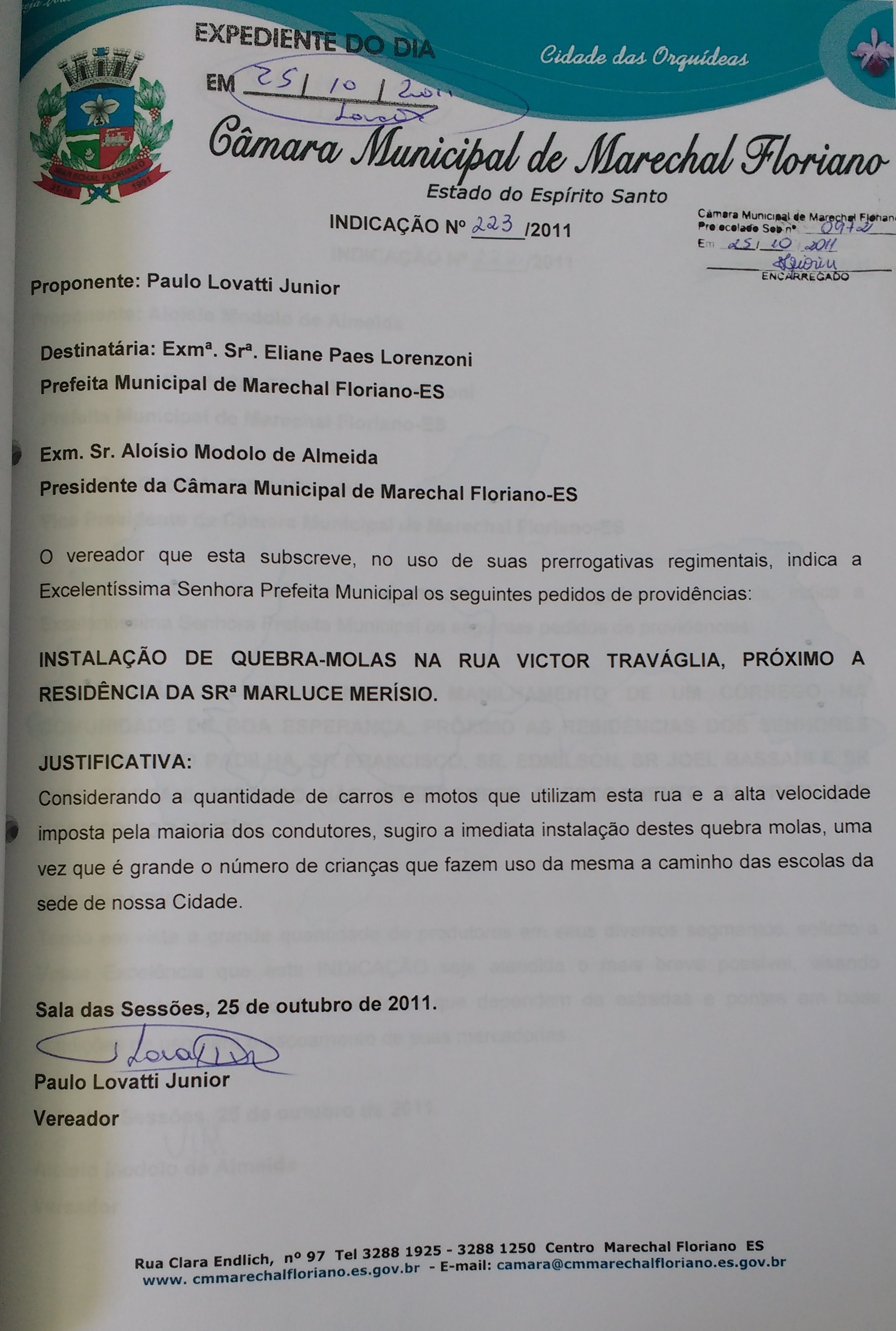 Ementa: INSTALAÇÃO DE QUEBRA-MOLAS NA RUA VICTOR TRAVÁGLIA, PRÓXIMO A RESIDENCIA DA SRª MARLUCE MERÍSIO.