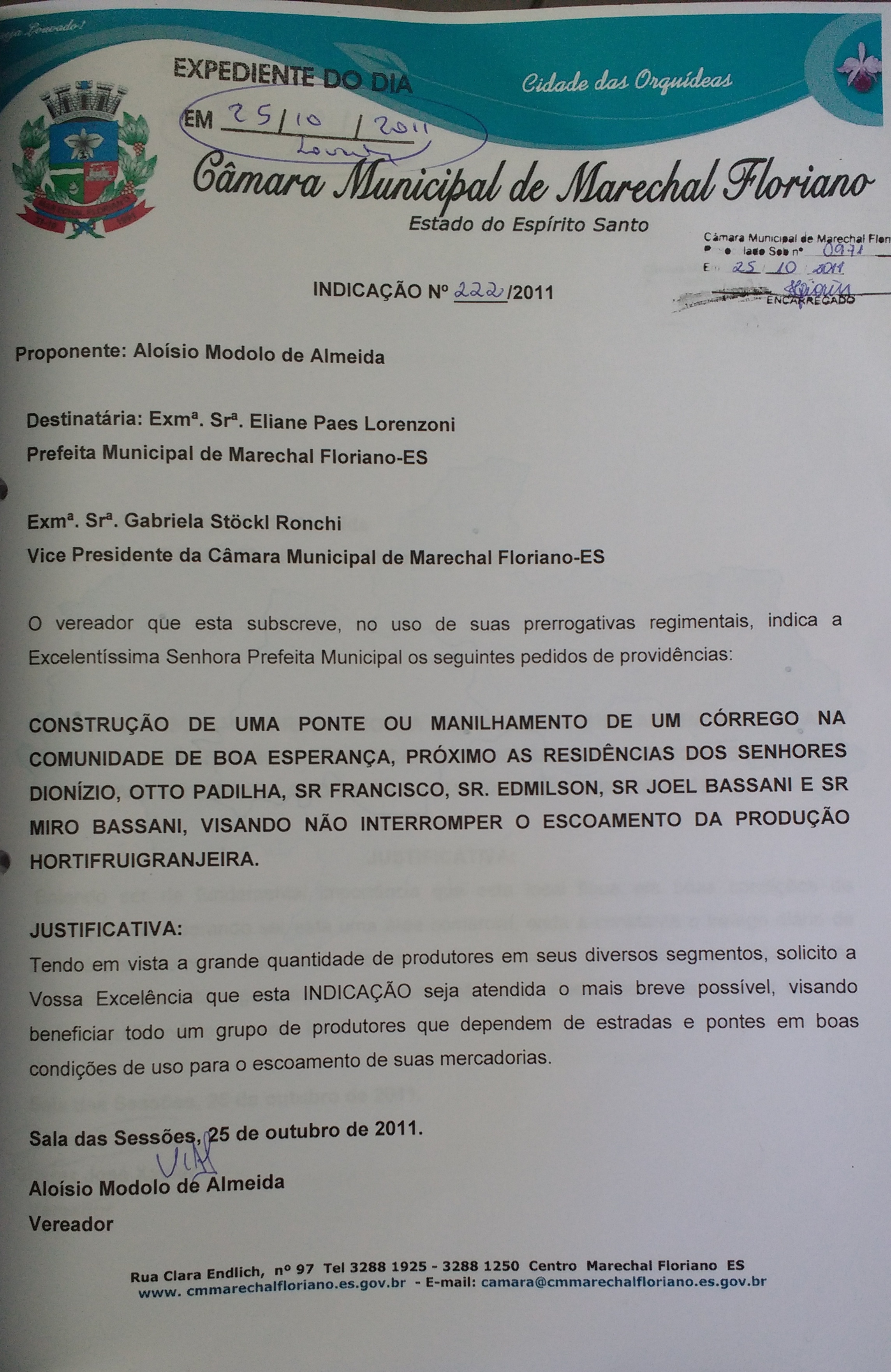 Ementa: CONSTRUÇÃO DE UMA PONTE OU MANILHAMENTO DE UM CÓRREGO NA COMUNIDADE DE BOA ESPERANÇA, PRÓXIMO AS RESIDÊNCIAS DOS SENHORES DIONIZIO, OTTO PADILHA, SR FRANCISCO, SR EDMILSON, SR JOEL BASSANI E SR MIRO BASSANI, VISANDO NÃO INTERROMPER O ESCOAMENTO DA PRODUÇÃO HORTIFRUIGRANJEIRA.