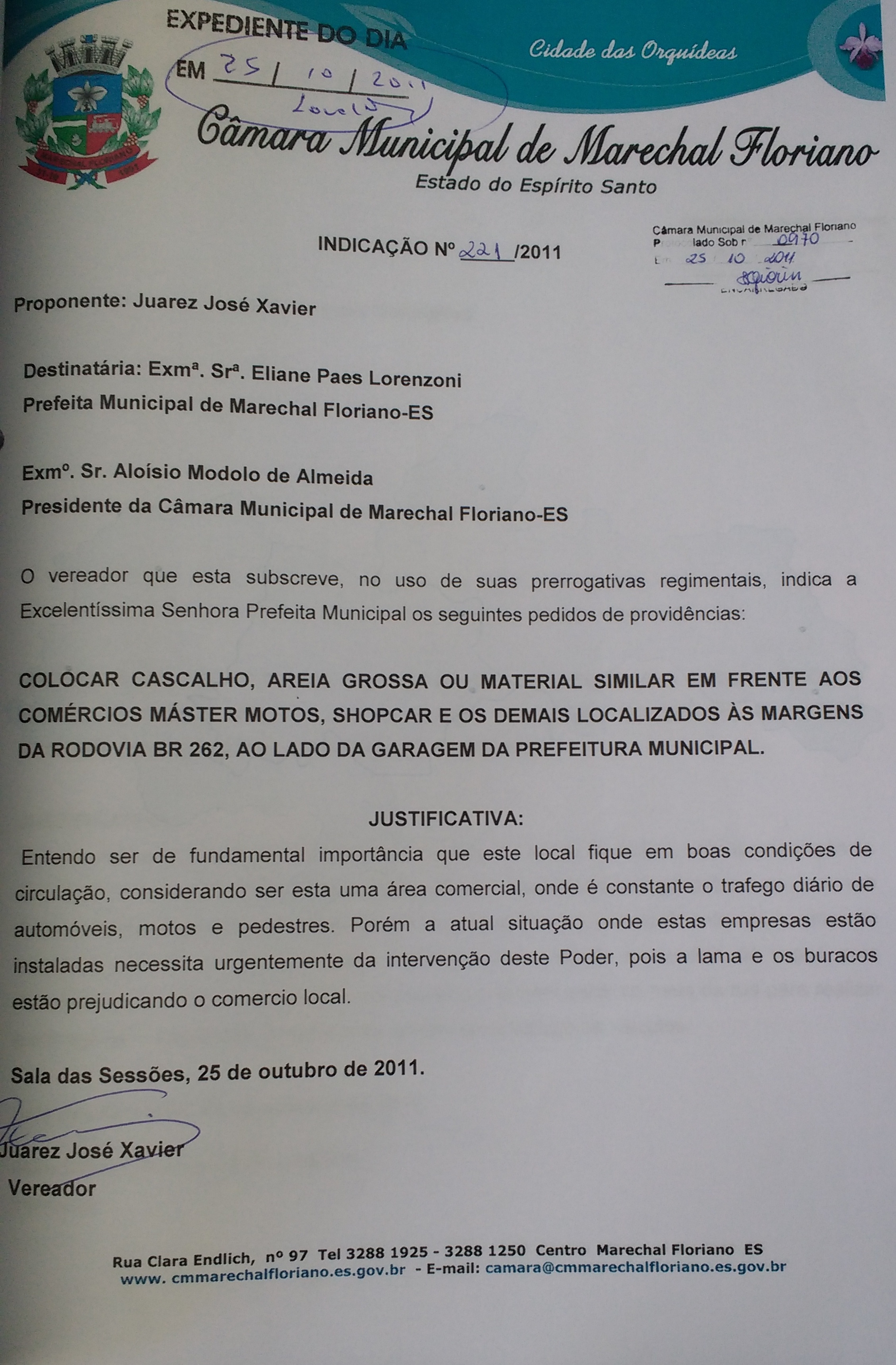 Ementa: COLOCAR CASCALHO, AREIA GROSSA OU MATERIAL SIMILAR EM FRENTE AOS COMÉRCIOS MÁSTER MOTOS, SHOPCAR E OS DEMAIS LOCALIZADOS ÀS MARGENS DA RODOVIA BR 262, AO LADO DA GARAGEM DA PREFEITURA MUNICIPAL.
