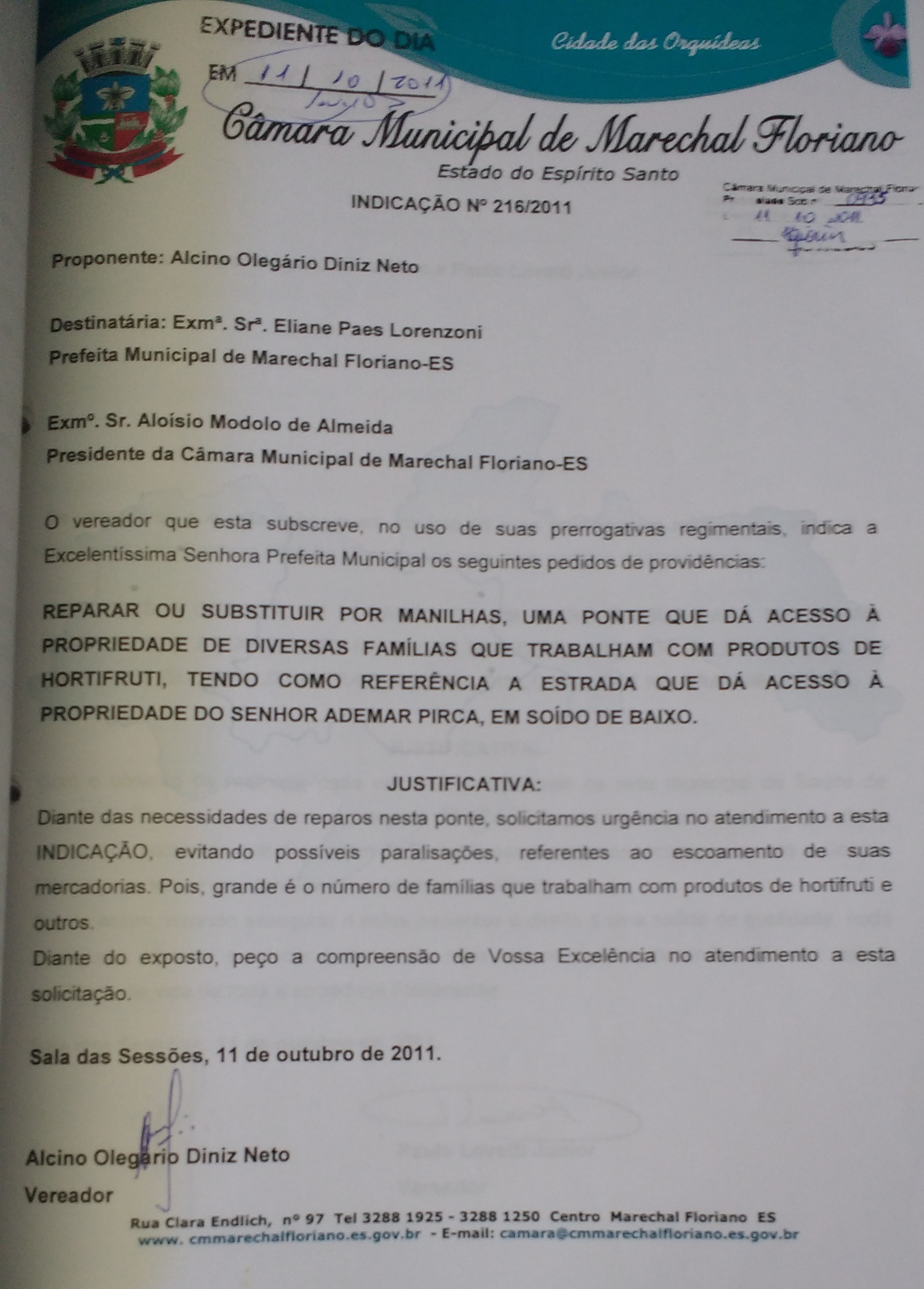 Ementa: REPARAR OU SUBSTITUIR POR MANILHAS, UMA PONTE QUE DÁ ACESSO À PROPRIEDADE DE DIVERSAS FAMÍLIAS QUE TRABALHAM COM PRODUTOS DE HORTIFRUTI,TENDO COMO REFERÊNCIA A ESTRADA QUE DÁ ACESSO À PROPRIEDADE DO SENHOR ADEMAR PIRCA, EM SOÍDO DE BAIXO.