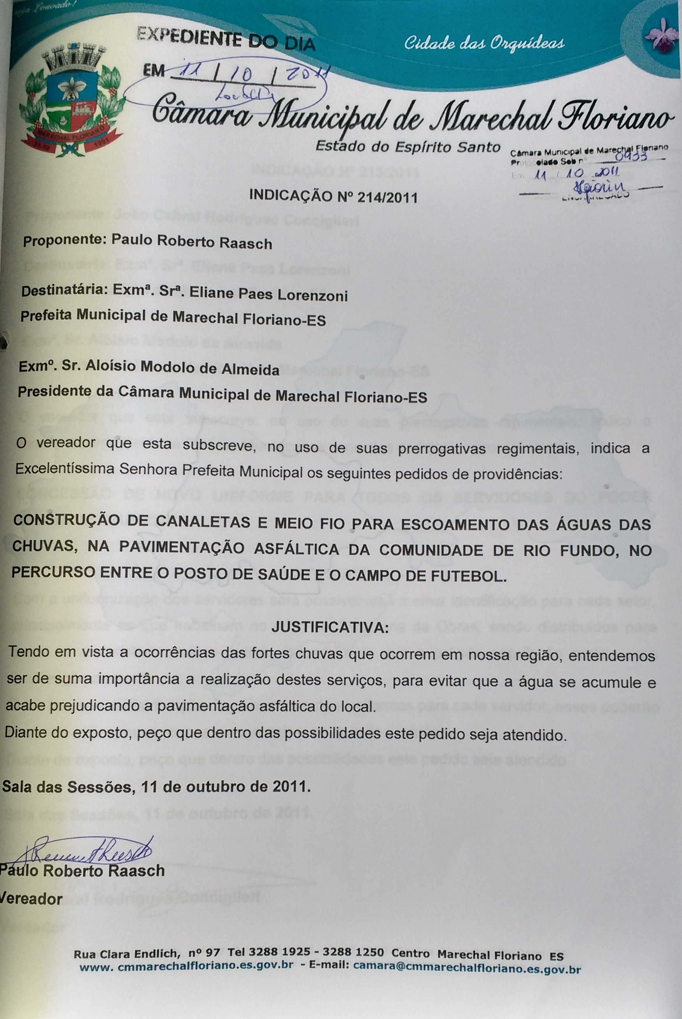 Ementa: CONSTRUÇÃO DE CANALETAS E MEIO FIO PARA ESCOAMENTO DAS ÁGUAS DAS CHUVAS, NA PAVIMENTAÇÃO ASFÁLTICA DA COMUNIDADE DE RIO FUNDO, NO PERCURSO ENTRE O POSTO DE SAÚDE E O CAMPO DE FUTEBOL.