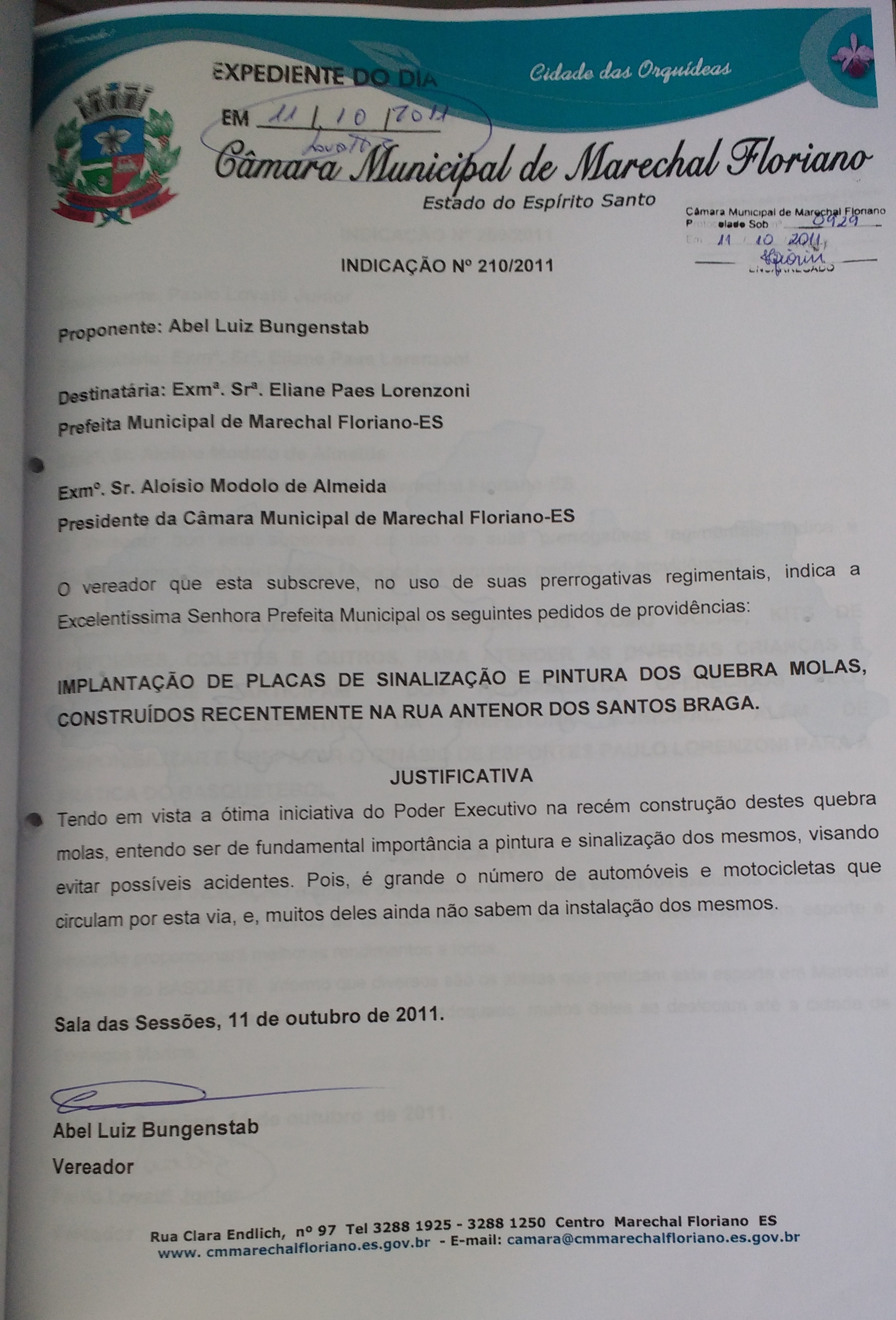 Ementa: IMPLANTAÇÃO DE PLACAS DE SINALIZAÇÃO E PINTURA DOS QUEBRA MOLAS, CONSTRUÍDOS RECENTEMENTE NA RUA ANTENOR DOS SANTOS BRAGA.
