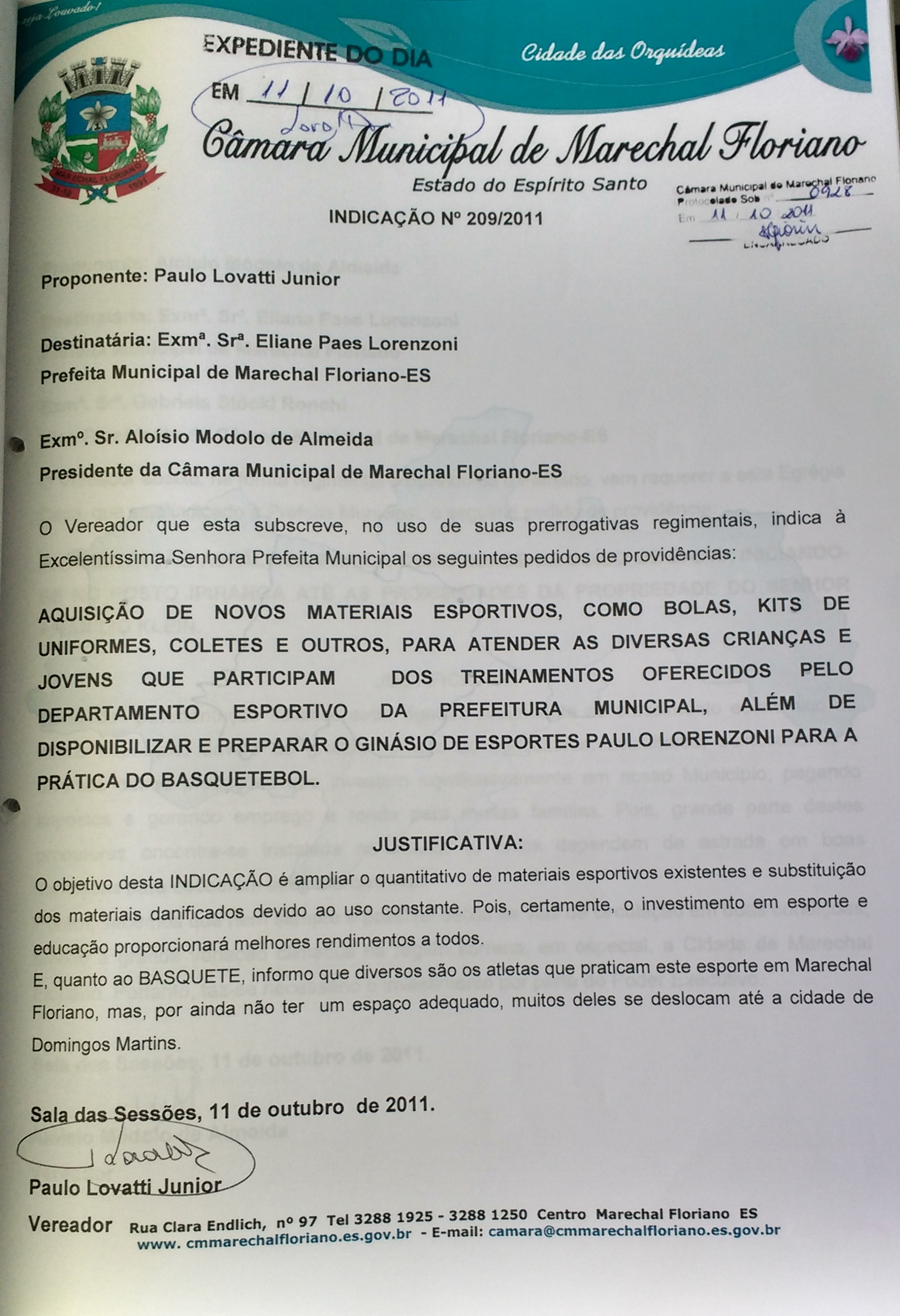Ementa: AQUISIÇÃO DE NOVOS MATERIAIS ESPORTIVOS, COMO BOLAS, KITS DE UNIFORMES, COLETES E OUTROS, PARA ATENDER AS DIVERSAS CRIANÇAS E JOVENS QUE PARTICIPAM DOS TREINAMENTOS OFERECIDOS PELO DEPARTAMENTO ESPORTIVO DA PREFEITURA MUNICIPAL, ALÉM DE DISPONIBILIZAR E PREPARAR O GINÁSIO DE ESPORTES PAULO LORENZONI PARA A PRÁTICA DO BASQUETEBOL.