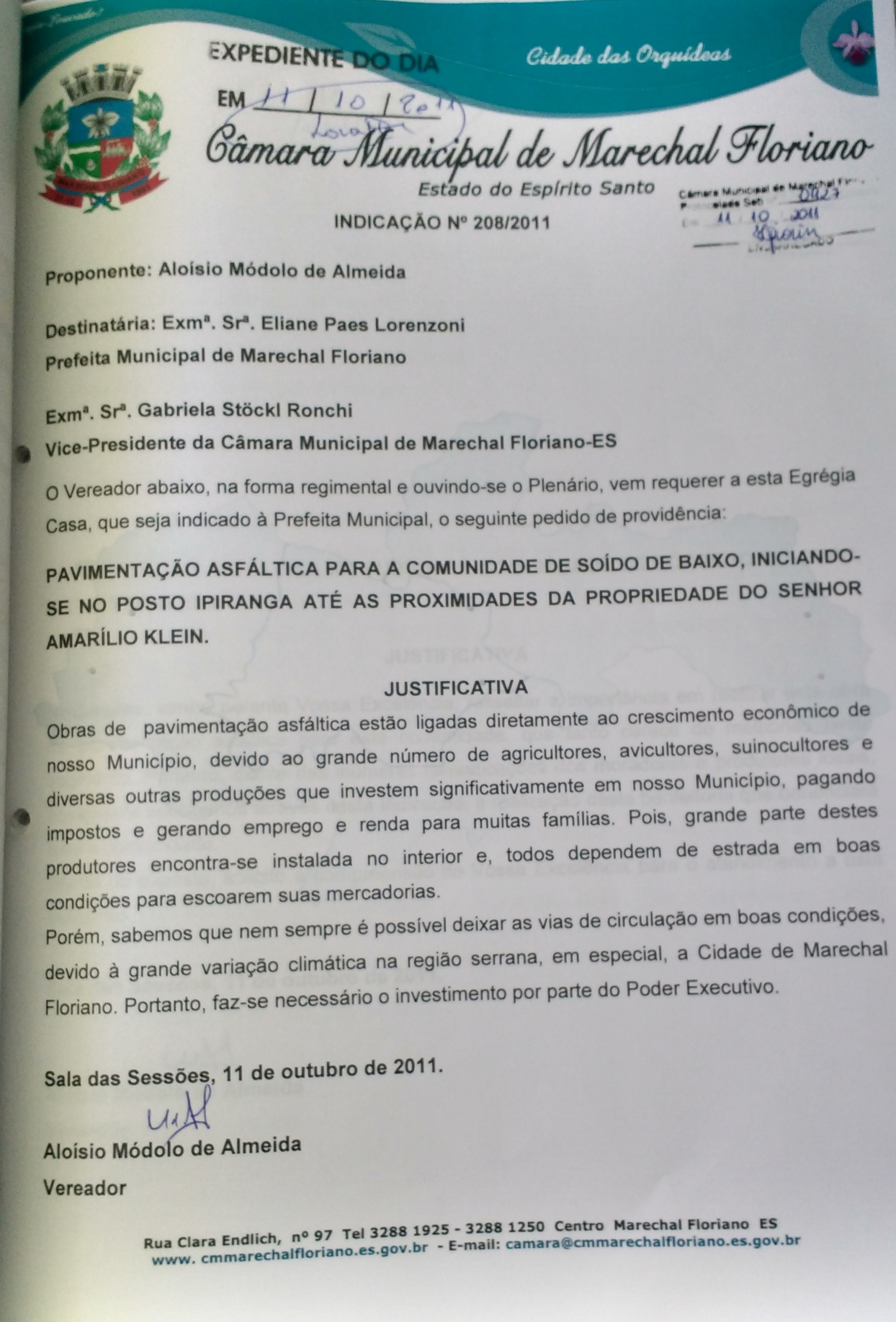 Ementa: PAVIMENTAÇÃO ASFÁLTICA PARA A COMUNIDADE DE SOÍDO DE BAIXO, INICIANDO-SE NO POSTO IPIRANGA ATÉ AS PROXIMIDADES DA PROPRIEDADE DO SENHOR AMARÍLIO KLEIN.