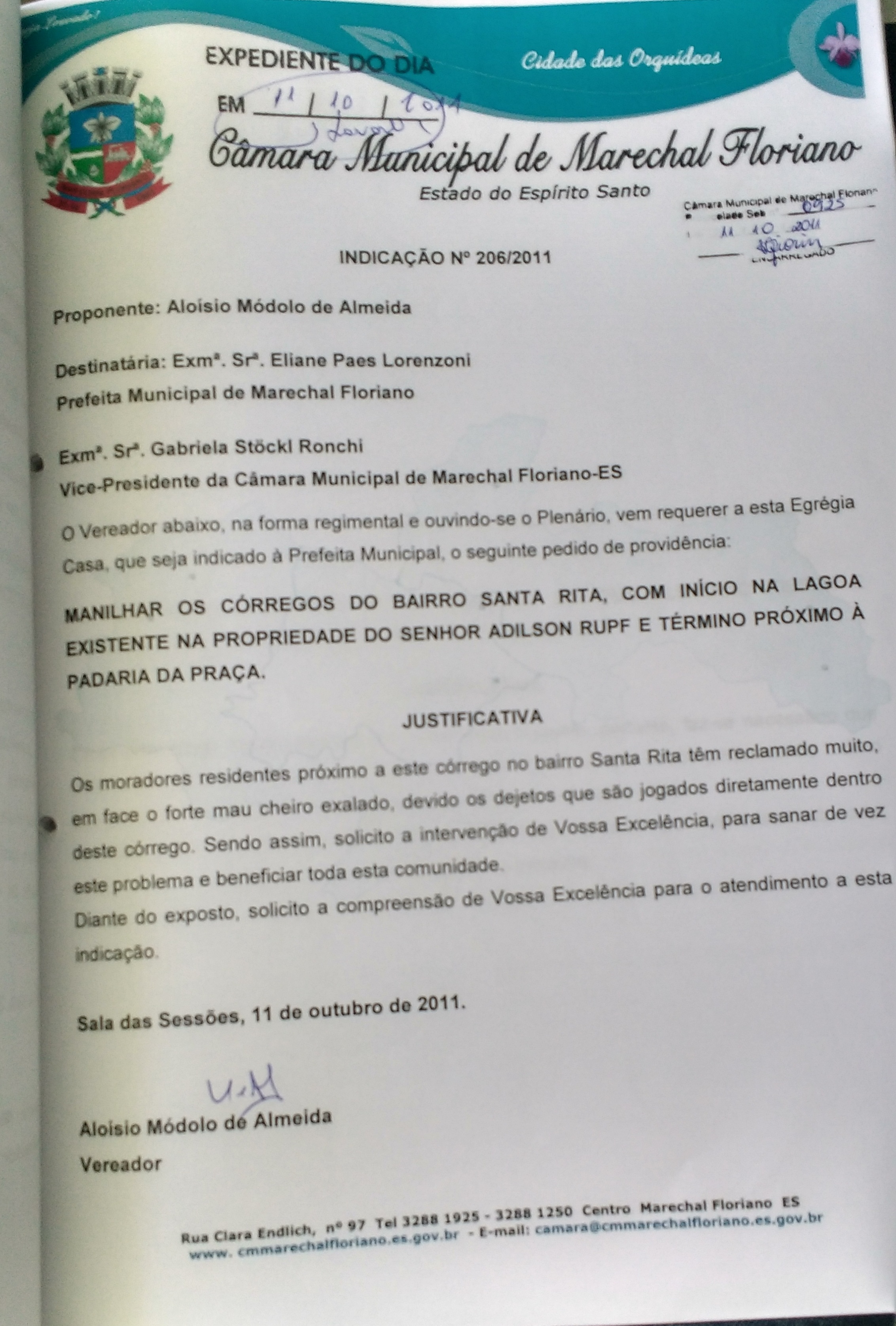 Ementa: MANILHAR OS CÓRREGOS DO BAIRRO SANTA RITA, COM INICIO NA LAGOA EXISTENTES NA PROPRIEDADE DO SENHOR ADILSON RUPF E TÉRMINO PRÓXIMO Á PADARIA DA PRAÇA.