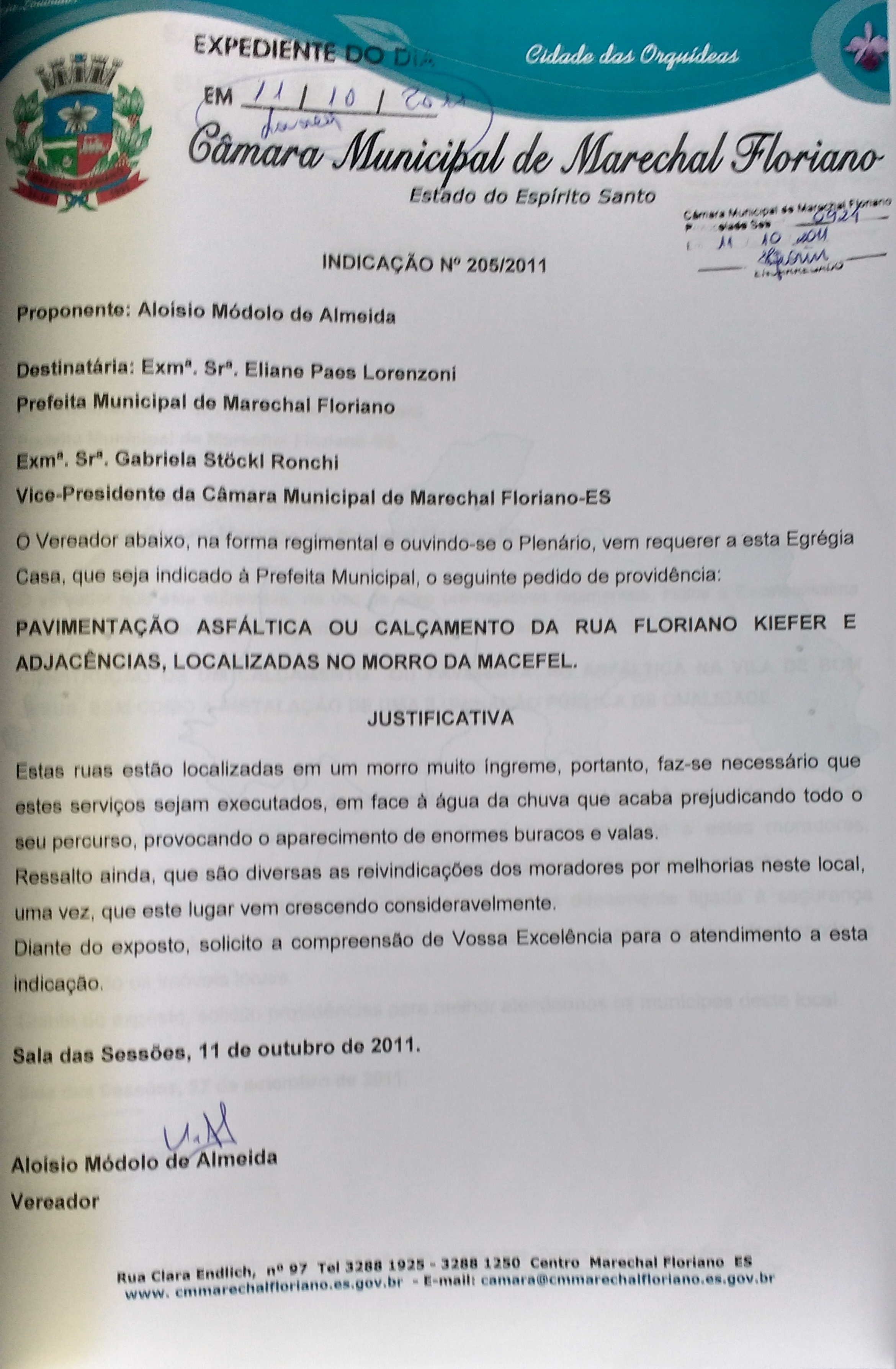 Ementa: PAVIMENTAÇÃO ASFÁLTICA OU CALÇAMENTO DA RUA FLORIANO KIEFER E ADJACÊNCIAS, LOCALIZADAS NO MORRO DA MACEFEL.