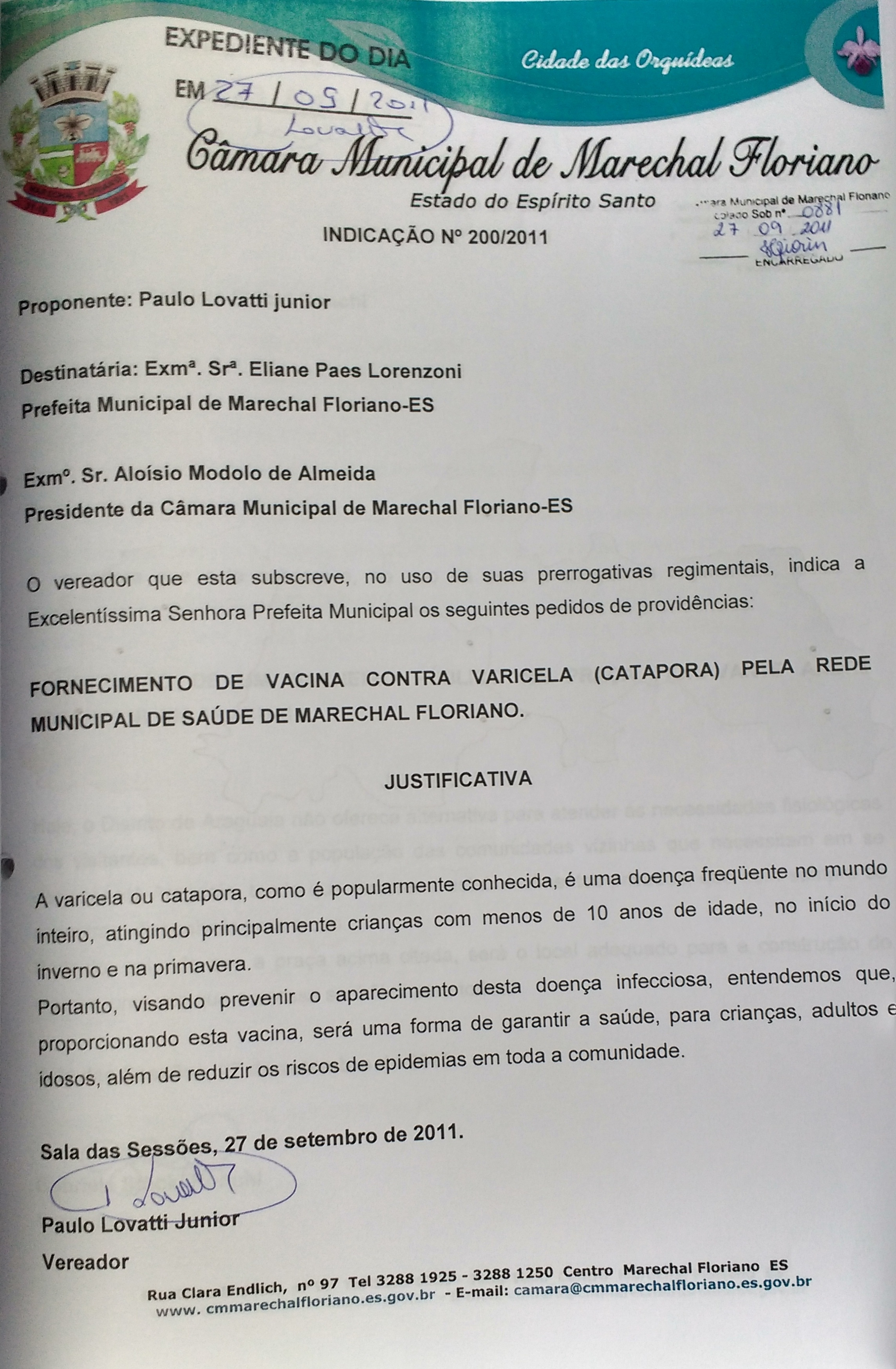 Ementa: FORNECIMENTO DE VACINA CONTRA VARICELA (CATAPORA) PELA REDE MUNICIPAL DE SAÚDE DE MARECHAL FLORIANO.