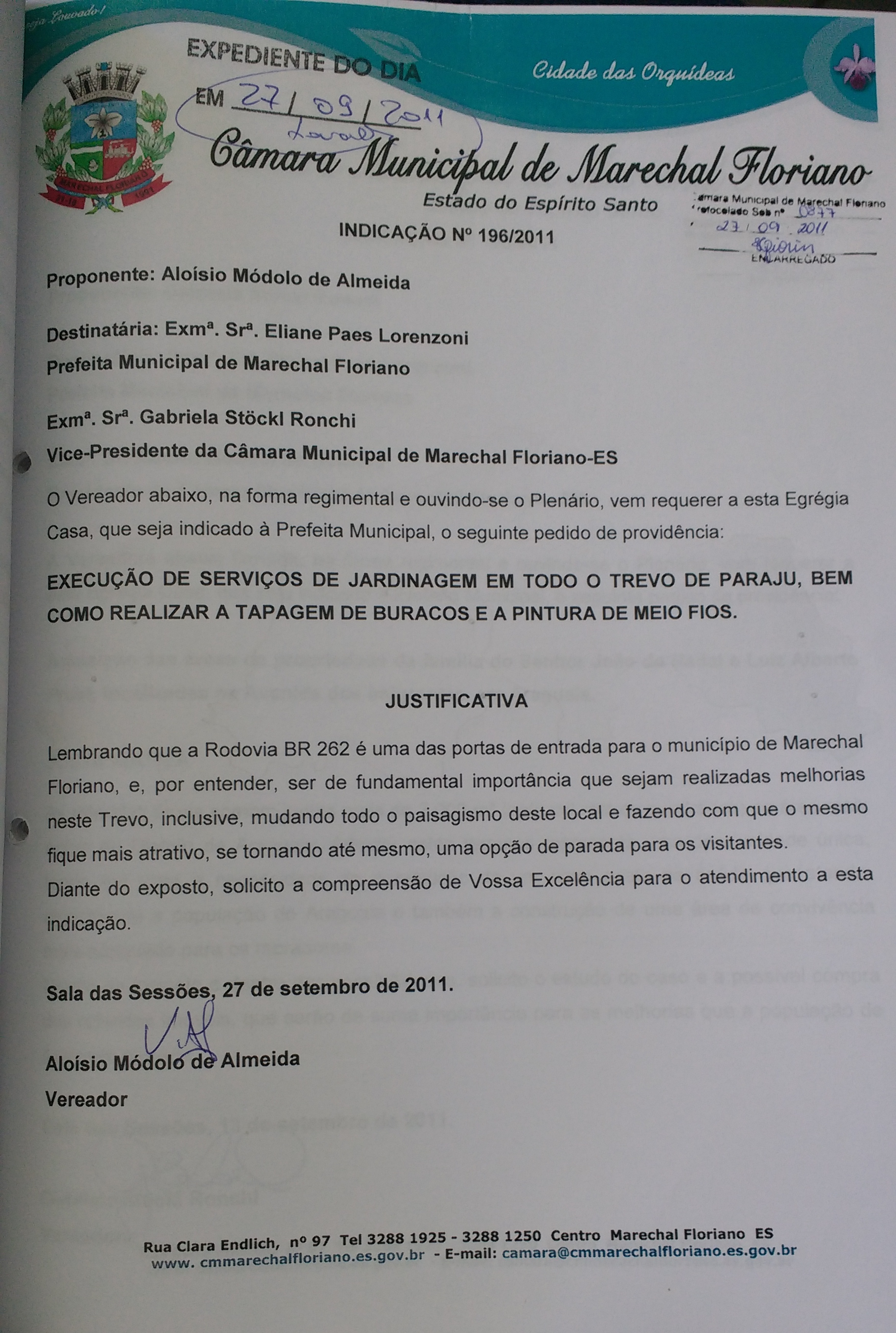 Ementa: EXECUÇÃO DE SERVIÇOS DE JARDINAGEM EM TODO O TREVO DE PARAJU, BEM COMO REALIZAR A TAPAGEM DE BURACOS E A PINTURA DE MEIOS FIOS.