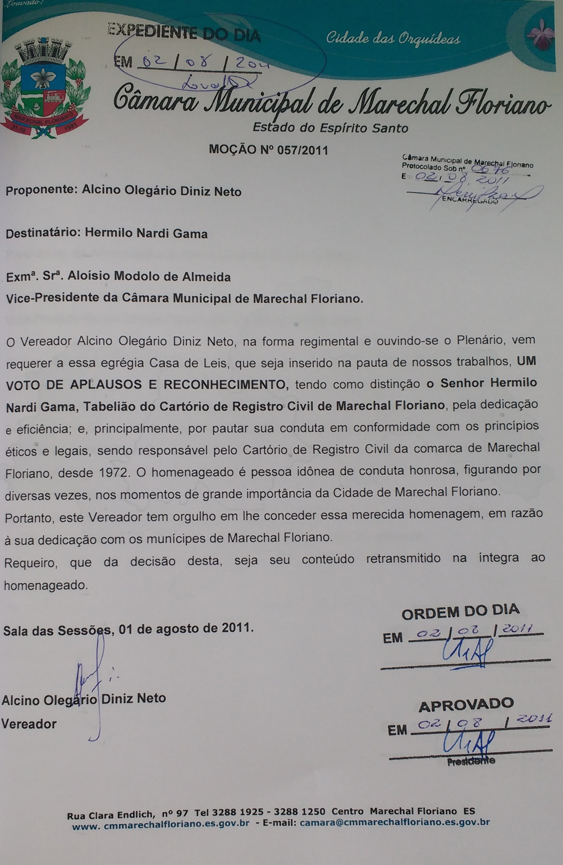 Ementa: UM VOTO DE APLAUSOS E RECONHECIMENTO O SENHOR HERMILO NARDI GAMA
