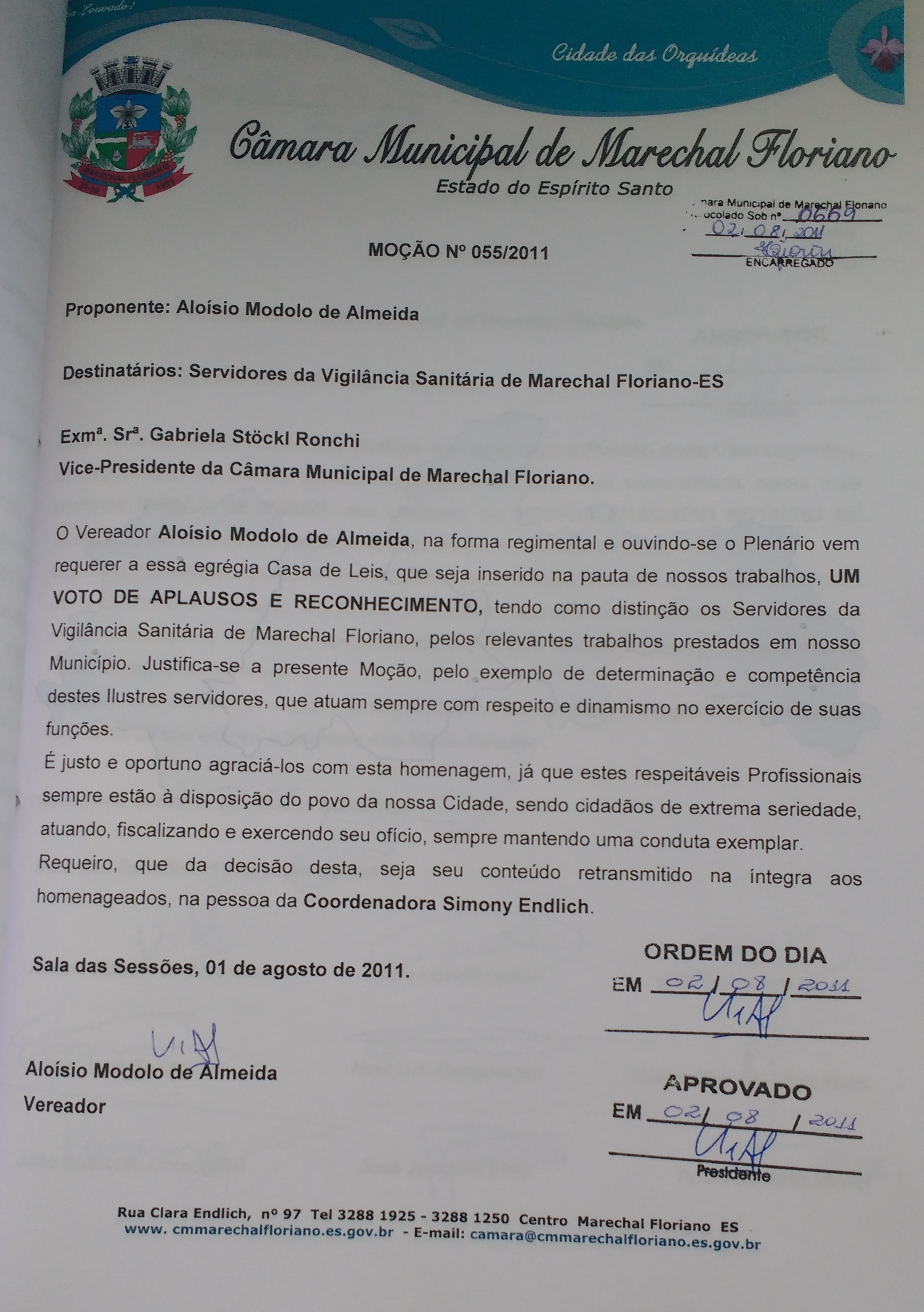 Ementa: UM VOTO DE APLAUSOS E RECONHECIMENTO EM DISTINÇÃO AOS SERVIDORES DA VIGILÂNCIA SANITÁRIA DE MARECHAL FLORIANO