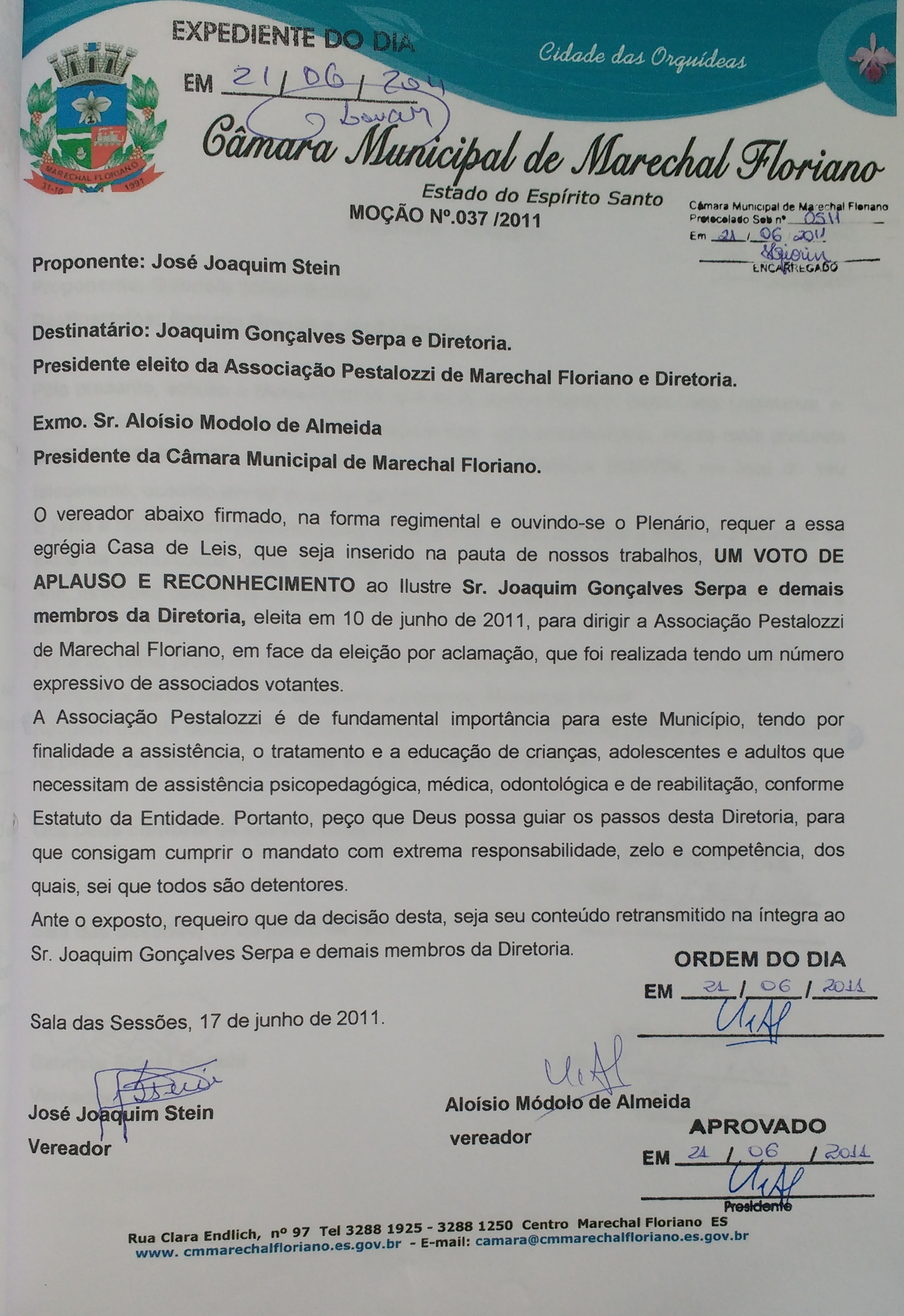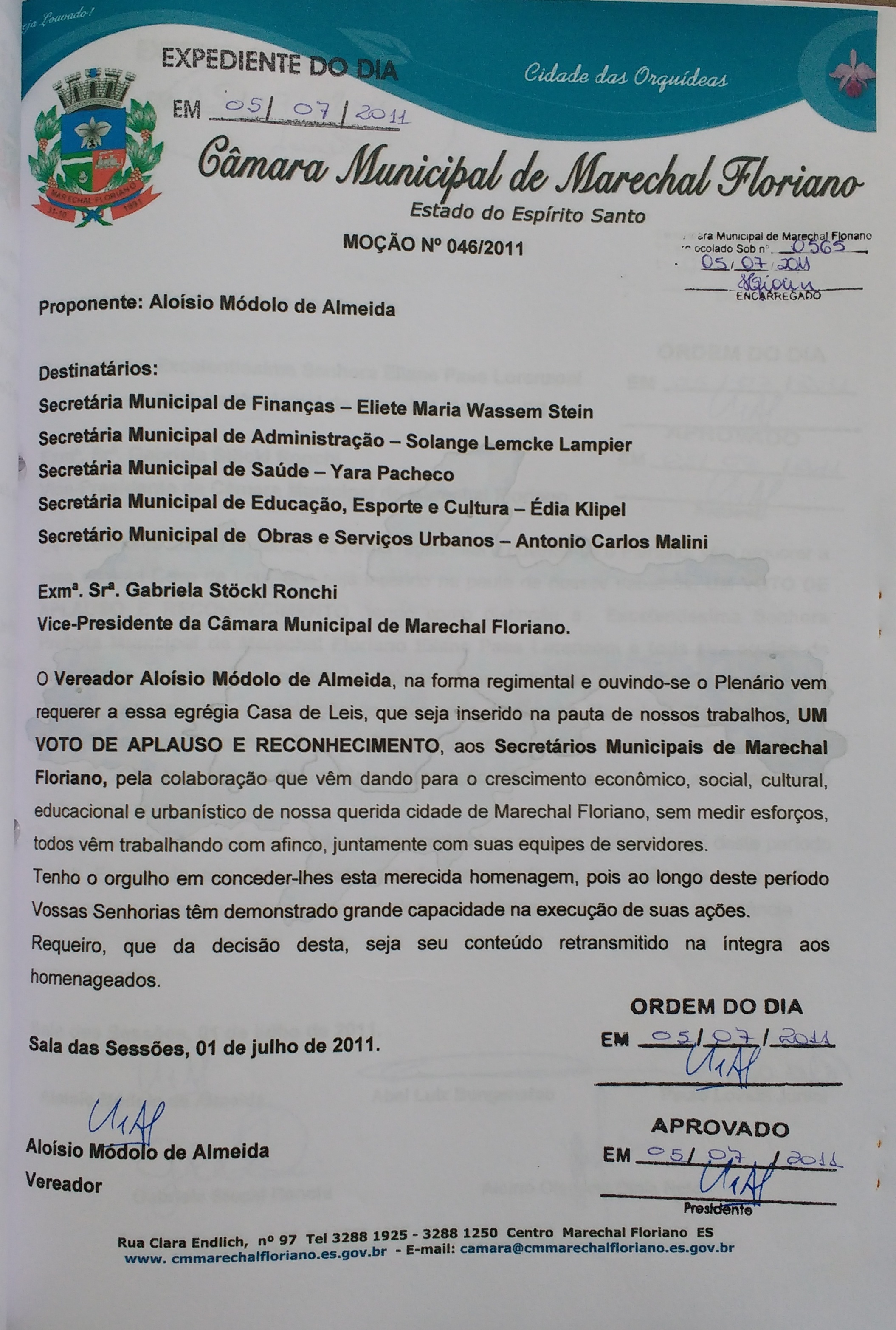 Ementa: UM VOTO DE APLAUSOS E RECONHECIMENTO AO EXCELENTÍSSIMO SENHOR JUIZ DE DIREITO DA CÂMARA DE MARECHAL FLORIANO