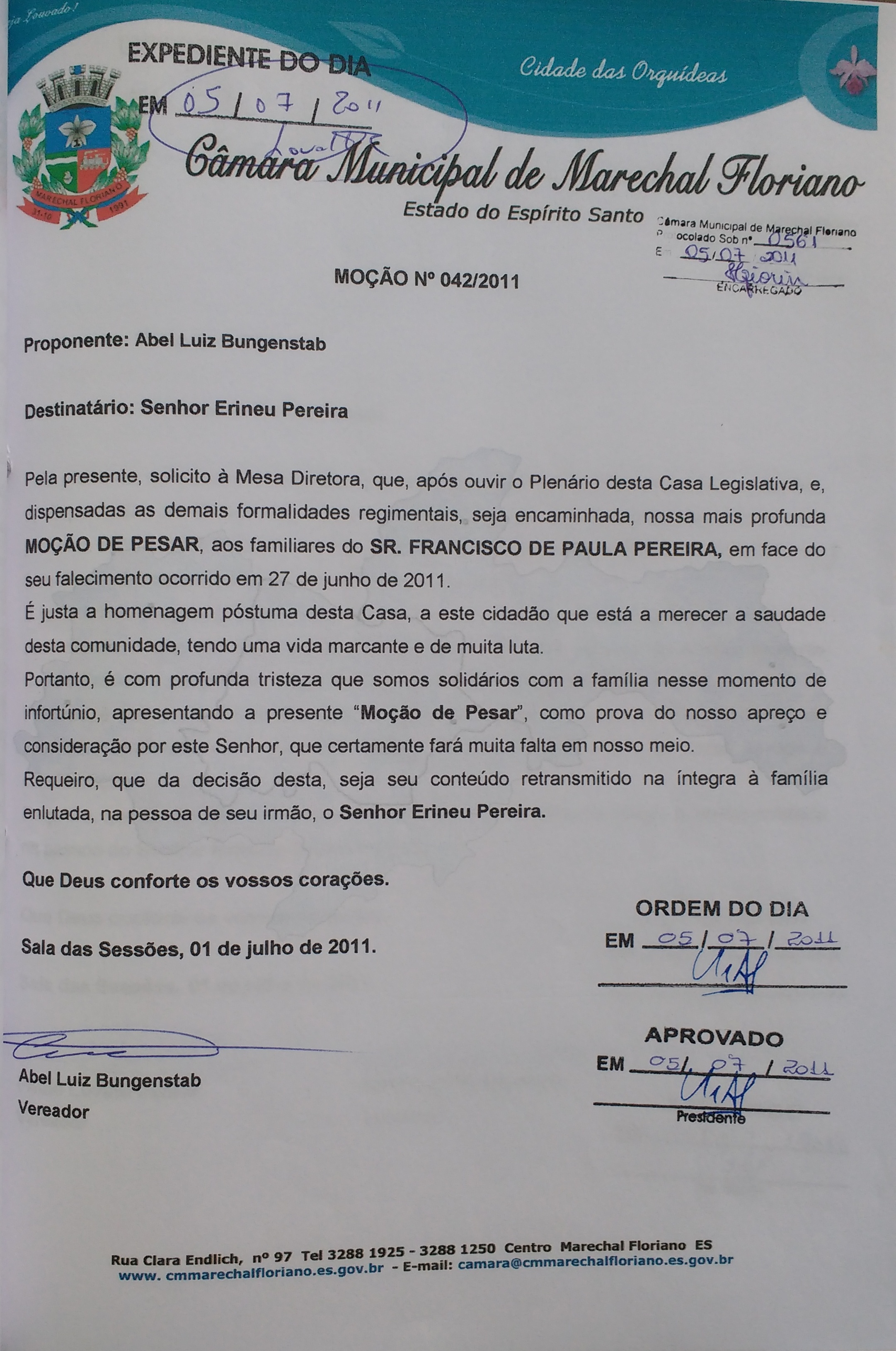 Ementa: MOÇÃO DE PESAR AO SR. FRANCISCO DE PAULA PEREIRA