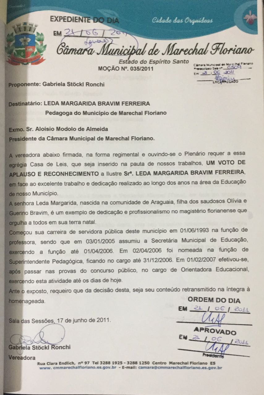 Ementa: UM VOTO DE APLAUSOS E RECONHECIMENTO A SRª. LEDA MARGARIDA BRAVIM FERREIRA