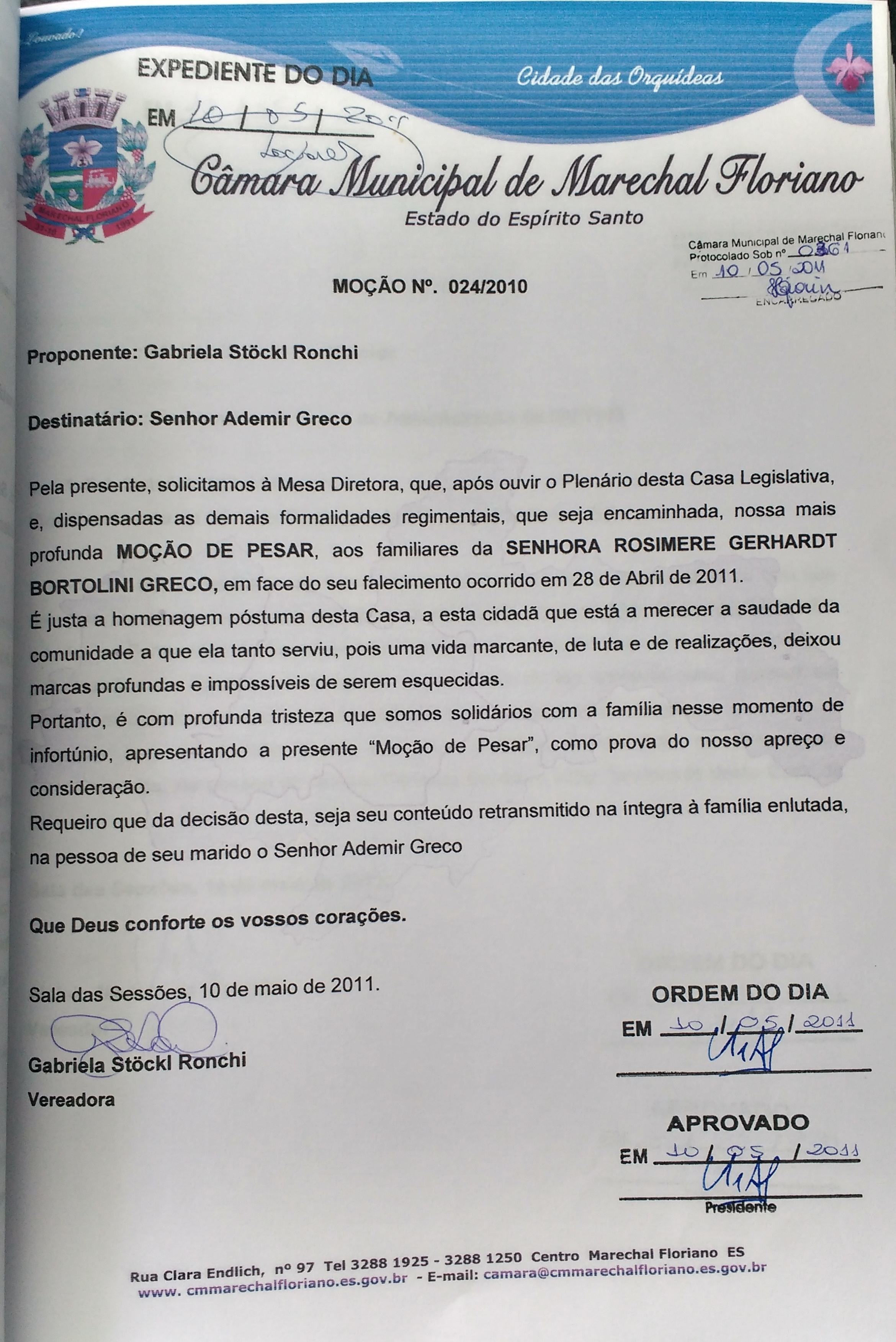 Ementa: MOÇÃO DE PESAR A SENHORA ROSIMERE GERHARDT BORTOLINI GRECO