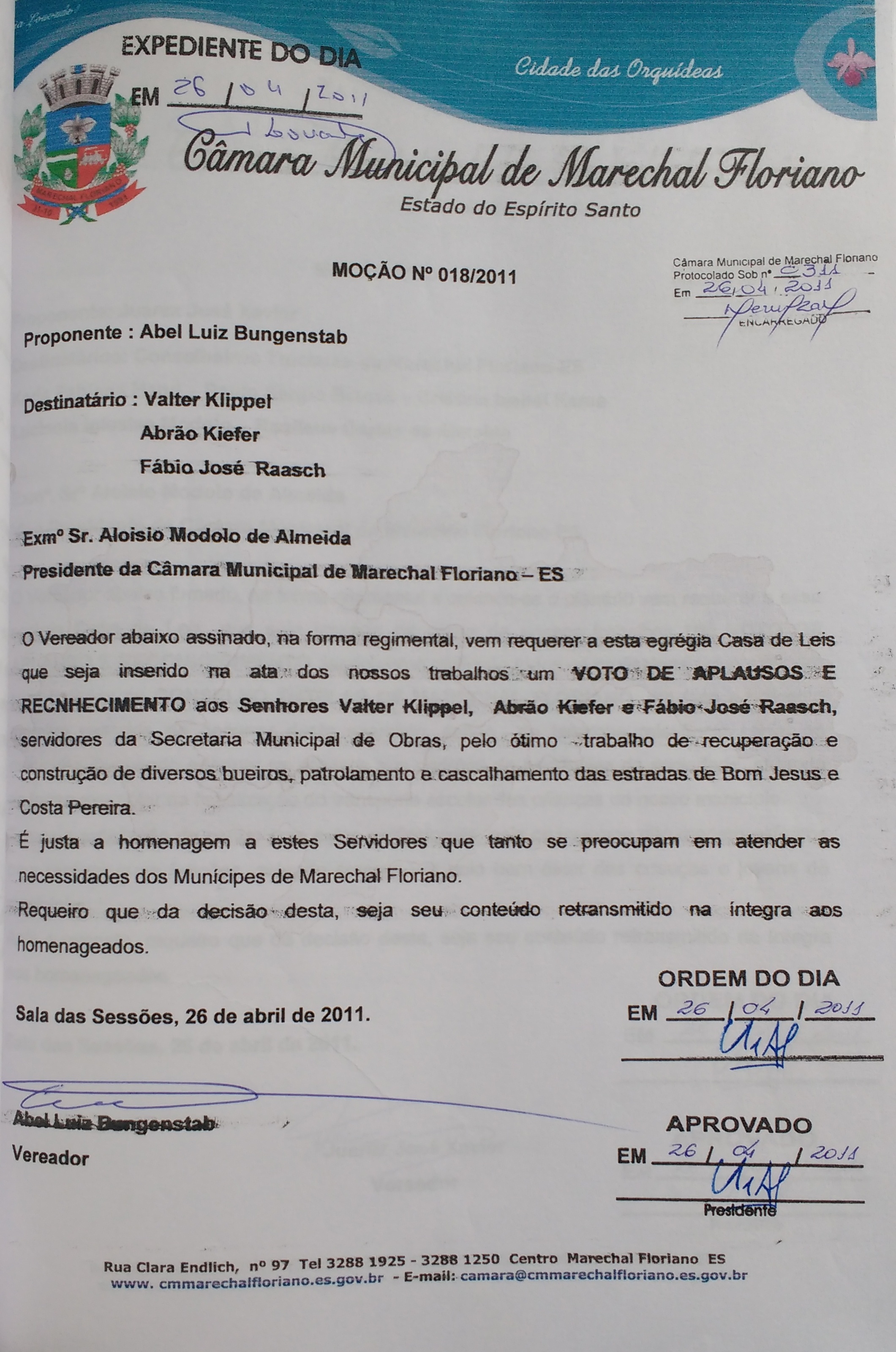 Ementa: VOTO DE APLAUSOS E RECONHECIMENTO AOS SENHORES VALTER KLIPPEL, ABRÃO KIEFER E FÁBIO JOSÉ RAASCH