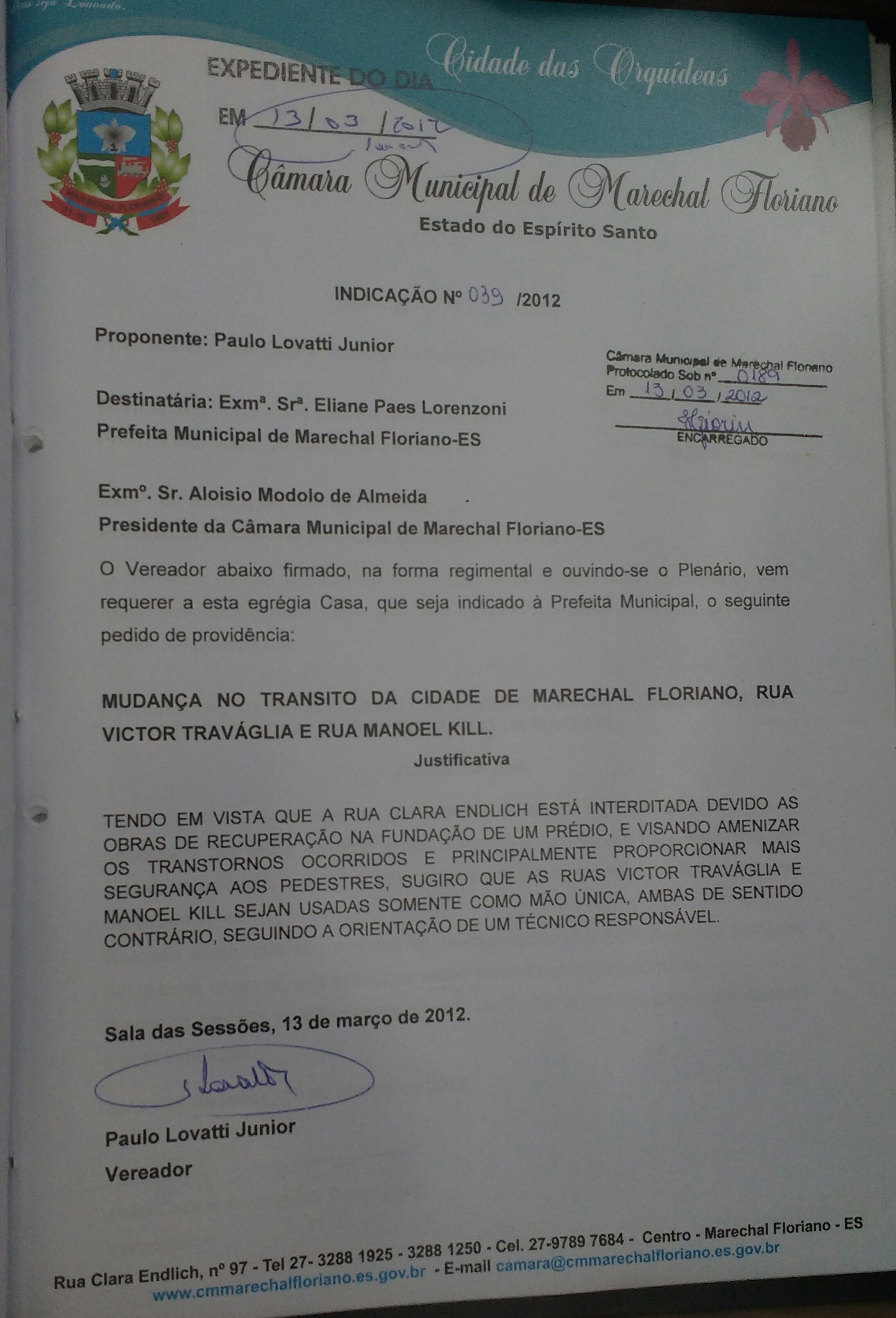 Ementa: MUDANÇA NO TRANSITO DA CIDADE DE MARECHAL FLORIANO, RUA VICTOR TRAVÁGLIA E RUA MANOEL KILL.
