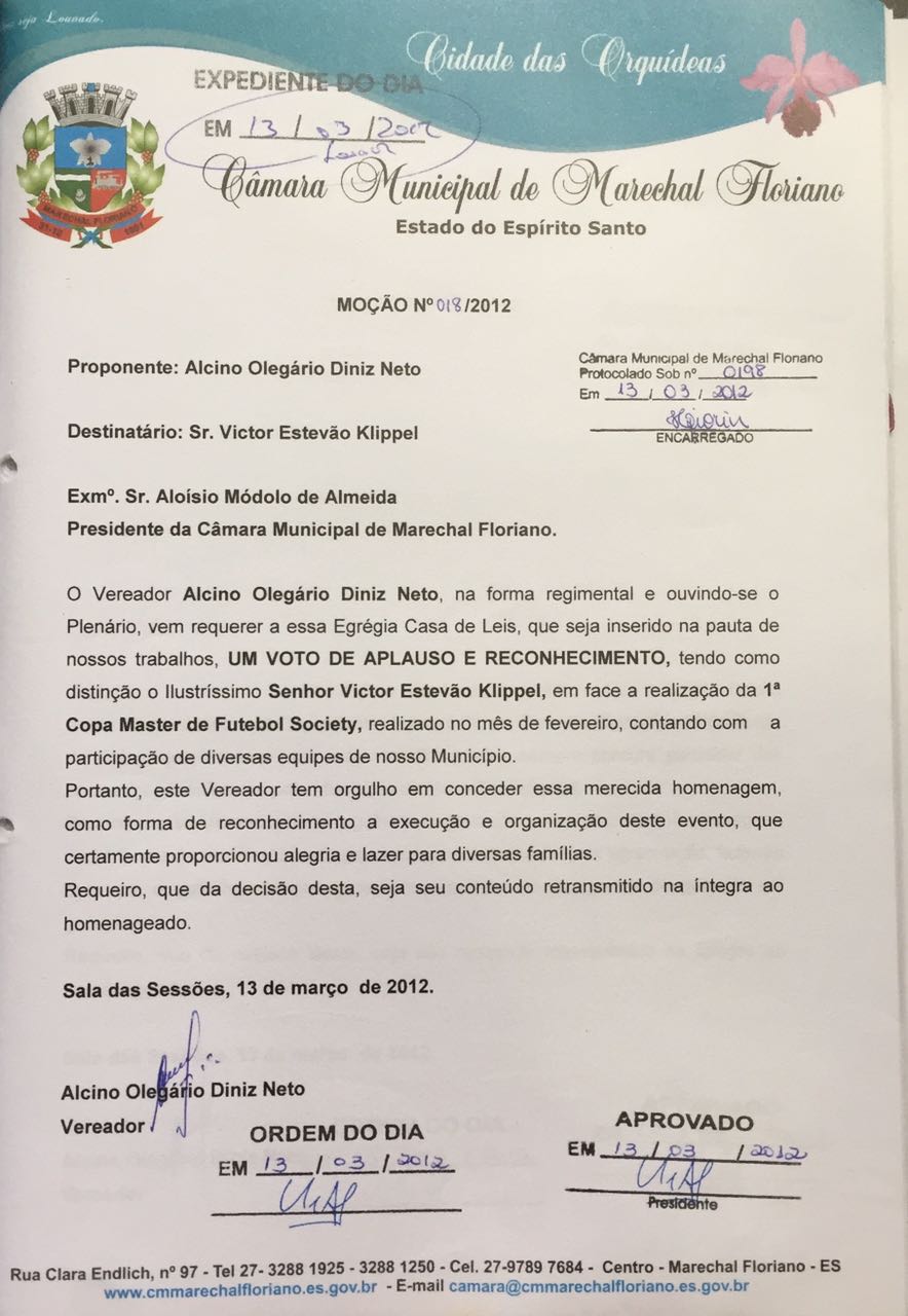 Ementa: MOÇÃO DE APLAUSO E RECONHECIMENTO, AO ILUSTRÍSSIMO SENHOR VICTOR ESTEVÃO KLIPPEL, EM FACE A REALIZAÇÃO DA 1ª COPA MASTER DE FUTEBOL SOCIETY.
