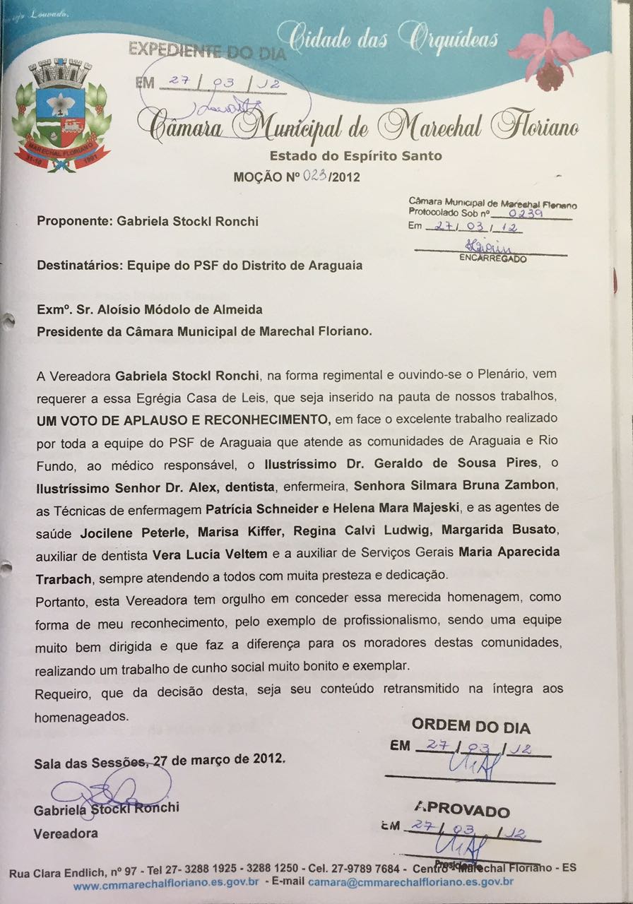 Ementa: MOÇÃO DE APLAUSO E RECONHECIMENTO, EM FACE DO EXCELENTE TRABALHO REALIZADO POR TODA A EQUIPE DO PSF DE ARAGUAIA QUE ATENDE AS COMUNIDADES DE ARAGUAIA E RIO FUNDO, AO MÉDICO RESPONSÁVEL,O ILUSTRÍSSIMO DR. GERALDO DE SOUSA PIRES, O ILUSTRÍSSIMO SENHOR DR.ALEX, DENTISTA, ENFERMEIRA, SENHOR SILMARA BRUNA ZAMBOM, AS TÉCNICAS DE ENFERMAGEM PATRICIA SCHNEIDER E HELENA MARA MAJESKI, E AS AGENTES DE SAÚDE JOCILENE PETERLE, MARISA KIFFER,REGINA CALVI LUDWIG, MARGARIDA BUSATO, AUXILIAR DE DENTISTA VERA LÚCIA VELTEM E A AUXILIAR DE ERVIÇOS GERAIS MARIA APARECIDA TRARBACH, SEMPRE ATENDENDO A TODOS COM MUITA PRESTEZA E DEDICAÇÃO.