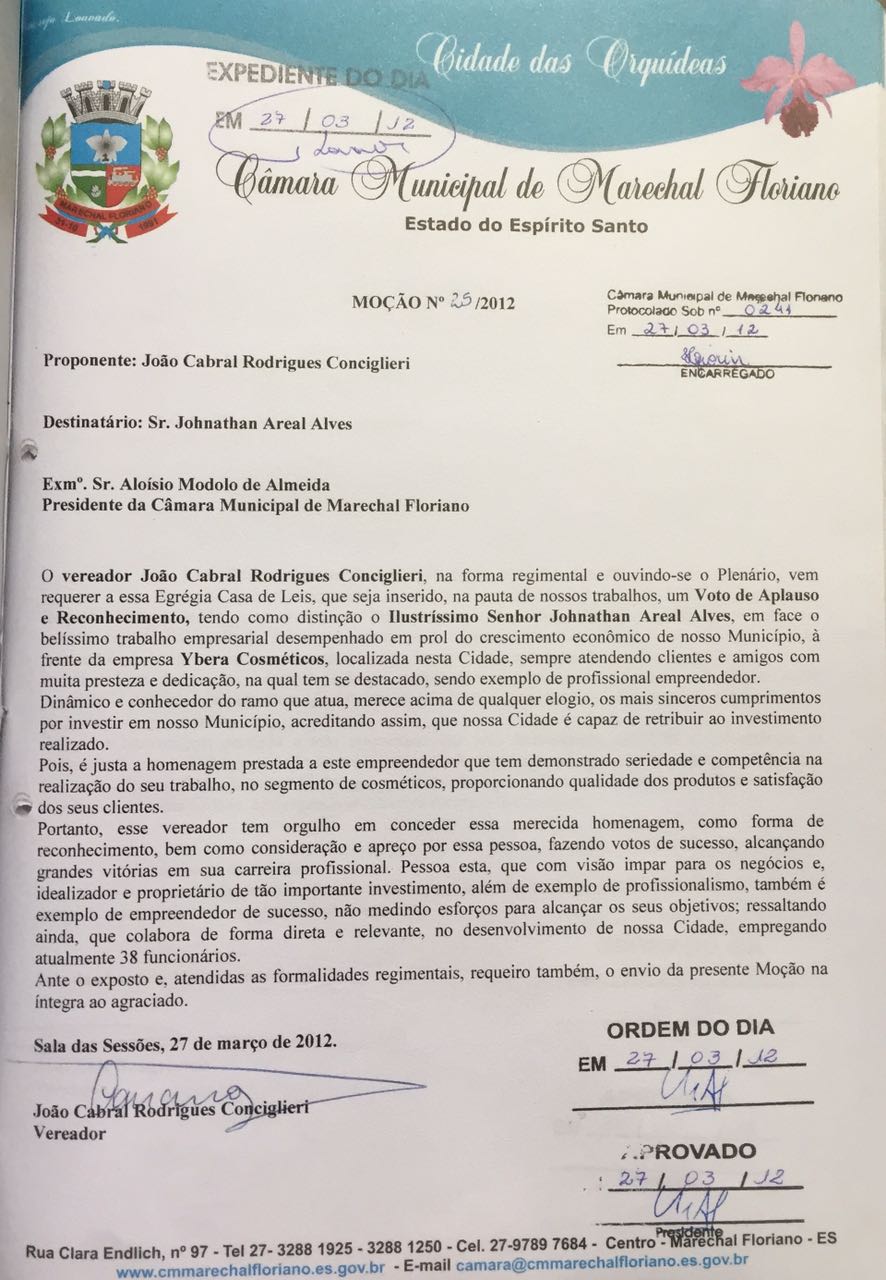 Ementa: MOÇÃO DE APLAUSO E RECONHECIMENTO, AO ILUSTRÍSSIMO SENHOR JOHNATHAN AREAL ALVES.