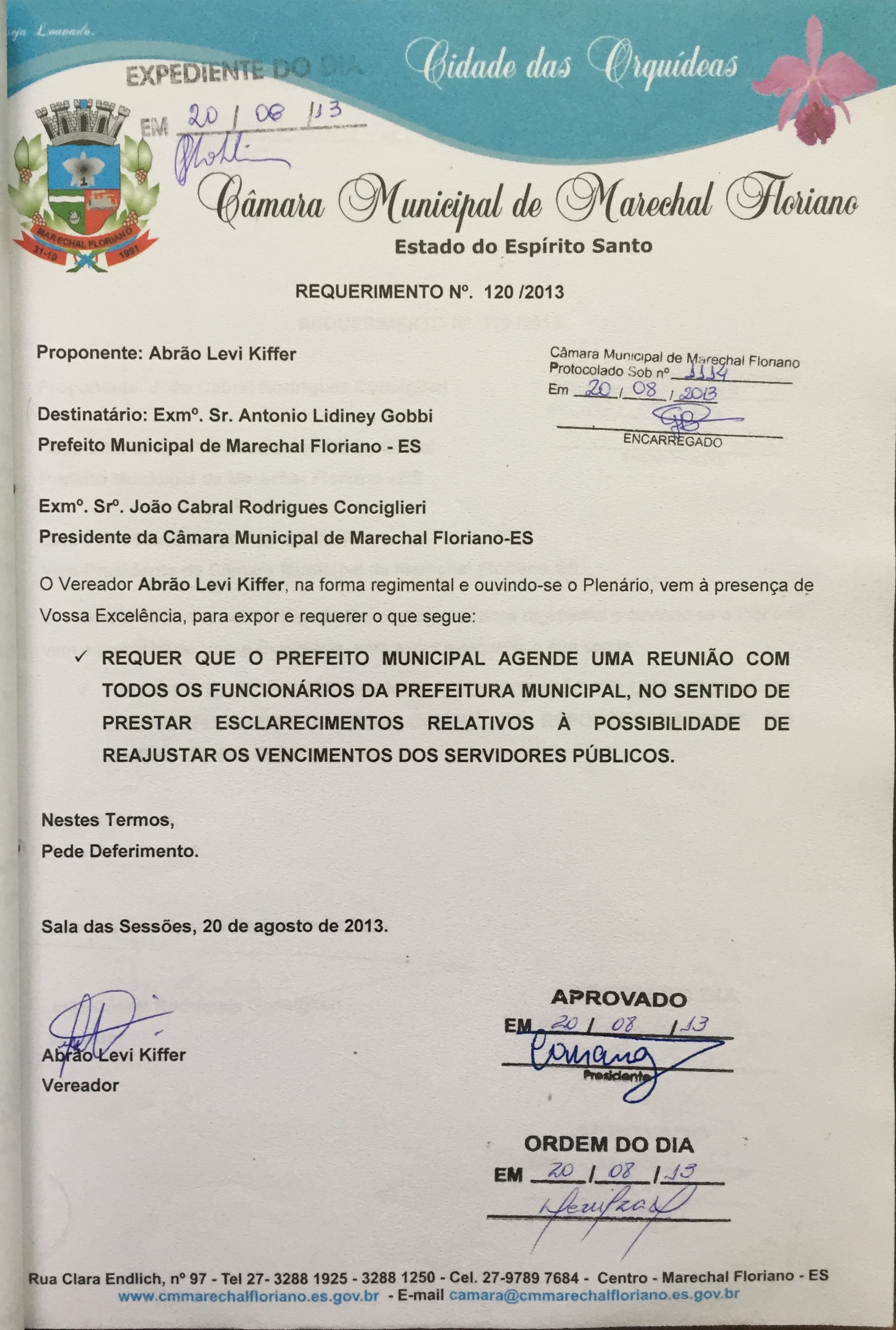 Ementa: REQUER QUE O PREFEITO MUNICIPAL AGENDE UMA REUNIÃO COM TODOS OS FUNCIONÁRIOS DA PREFEITURA MUNICIPAL, NO SENTIDO DE PRESTAR ESCLARECIMENTOS RELATIVOS À POSSIBILIDADE DE REAJUSTAR OS VENCIMENTOS DOS SERVIDORES PÚBLICOS.