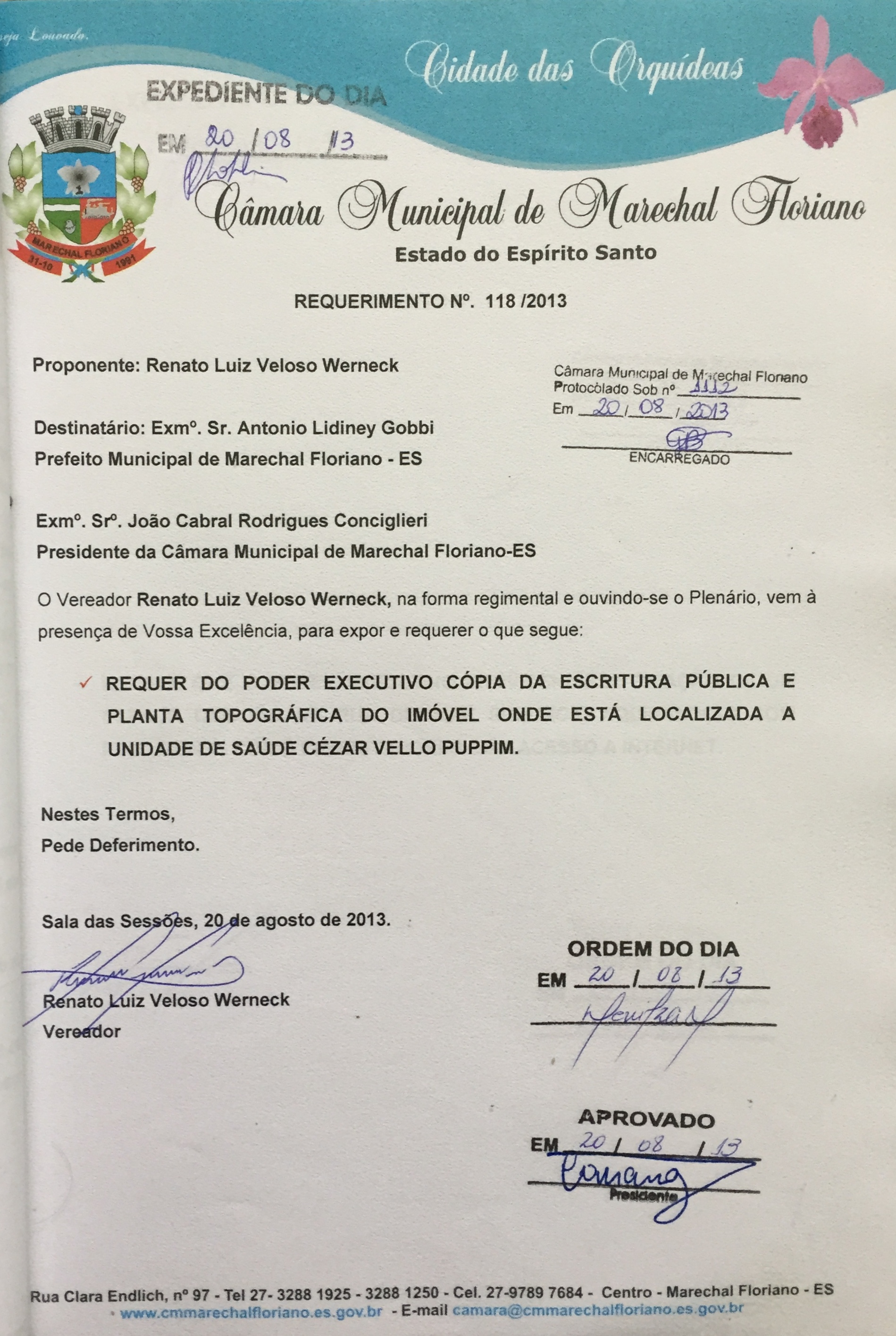 Ementa: REQUER DO PODER EXECUTIVO CÓPIA DA ESCRITURA PÚBLICA E PLANTA TOPOGRÁFICA DO IMÓVEL ONDE ESTÁ LOCALIZADA A UNIDADE DE SAÚDE CÉZAR VELLO PUPPIM.