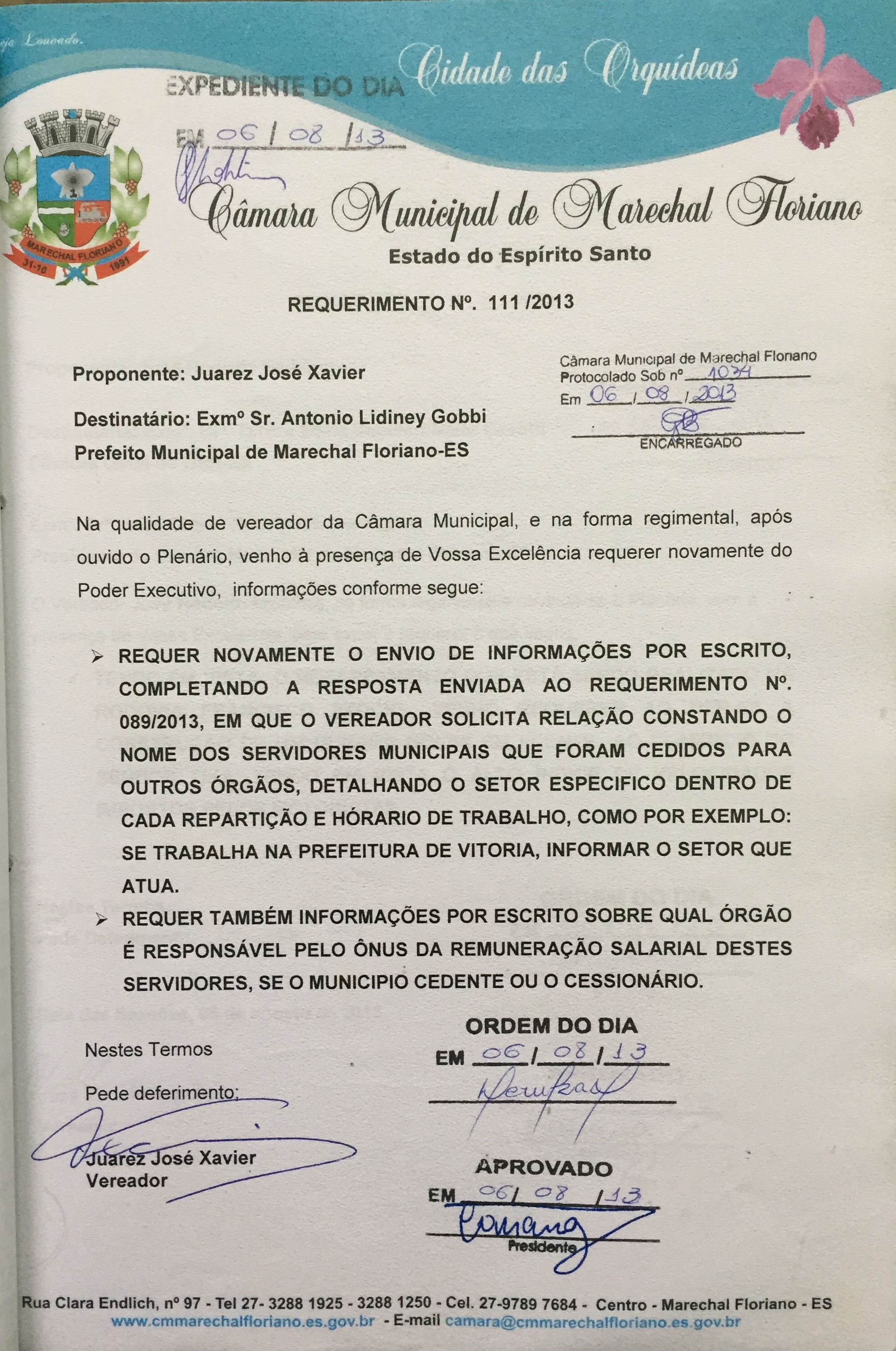 Ementa: REQUER NOVAMENTE O ENVIO DE INFORMAÇÕES POR ESCRITO, COMPLETANDO A RESPOSTA ENVIADA AO REQUERIMENTO N°. 089/2013, EM QUE O VEREADOR SOLICITA RELAÇÃO CONSTATANDO O NOME DOS SERVIDORES MUNICIPAIS QUE FORAM CEDIDOS PARA OUTROS ÓRGÃOS, DETALHANDO O SETOR ESPECIFICO DENTRO DE CADA REPARTIÇÃO E HORÁRIO DE TRABALHO, COMO POR EXEMPLO: SE TRABALHA NA PREFEITURA DE VITÓRIA, INFORMAR O SETOR QUE ATUA.