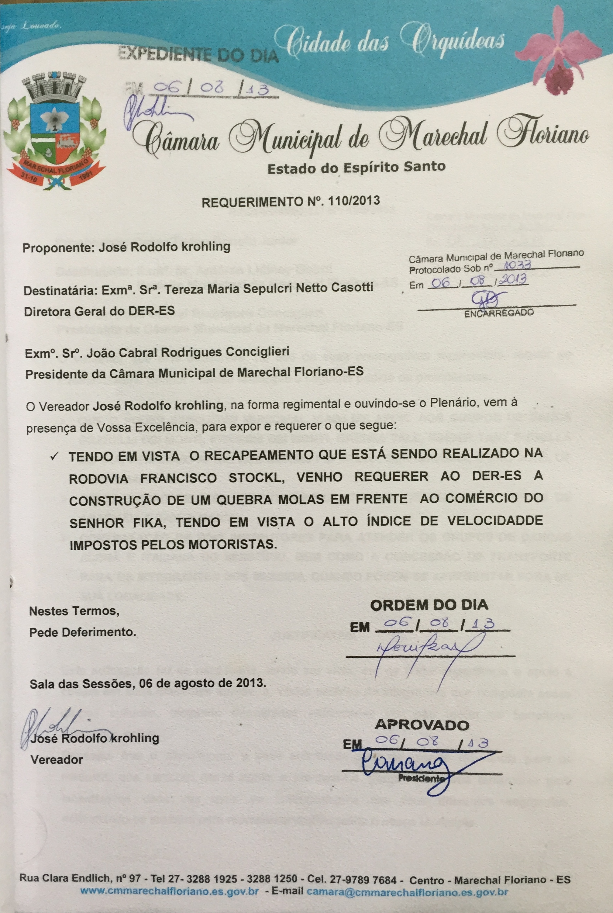 Ementa: VENHO REQUERER AO DER-ES A CONSTRUÇÃO DE UM QUEBRA MOLAS EM FRENTE AO COMÉRCIO DO SENHO FIKA, TENDO EM VISTA O ALTO ÍNDICE DE VELOCIDADE IMPOSTOS PELO MOTORISTAS.