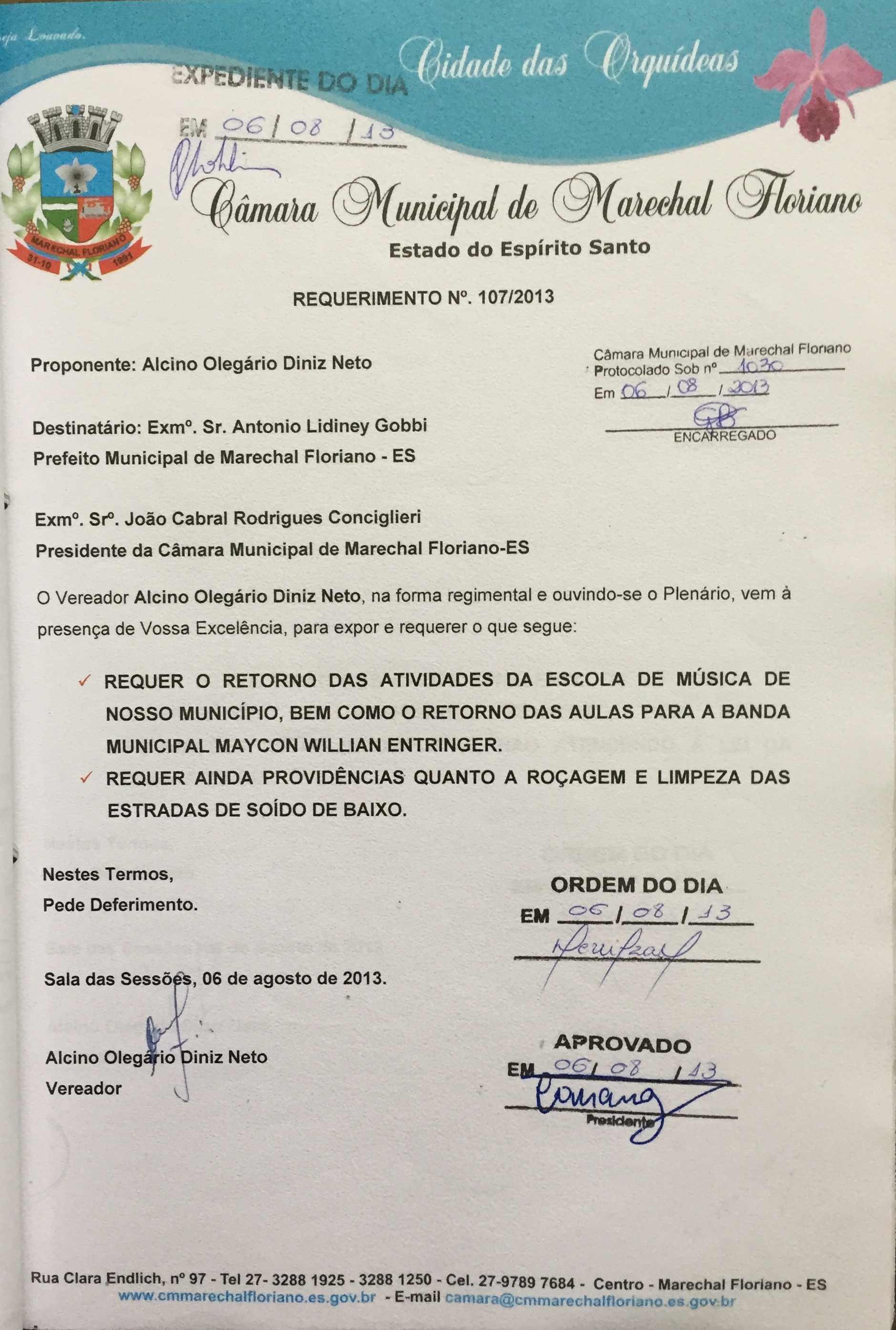 Ementa: REQUER O RETORNO DAS ATIVIDADES DA ESCOLA DE MÚSICA DE NOSSO MUNICÍPIO, BEM COMO O RETORNO DAS AULAS PARA A BANDA MUNICIPAL MAYCON WILLIAN ENTRINGER.