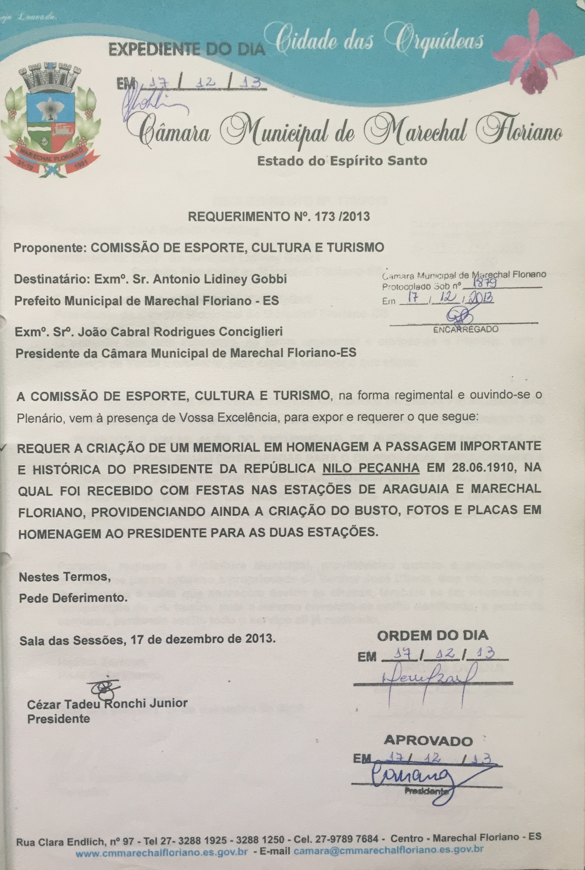 Ementa: REQUER A CRIAÇÃO DE UM MEMORIAL EM HOMENAGEM A PASSAGEM IMPORTANTE E HISTÓRICA DO PRESIDENTE DA REPÚBLICA NILO PEÇANHA EM 28.06.1910, NA QUAL FOI RECEBIDO COM FESTAS NAS ESTAÇÕES DE ARAGUAIA E MARECHAL FLORIANO, PROVIDENCIANDO AINDA A CRIAÇÃO DO BUSTO, FOTOS E PLACAS EM HOMENAGEM AO PRESIDENTE PARA AS DUAS ESTAÇÕES.