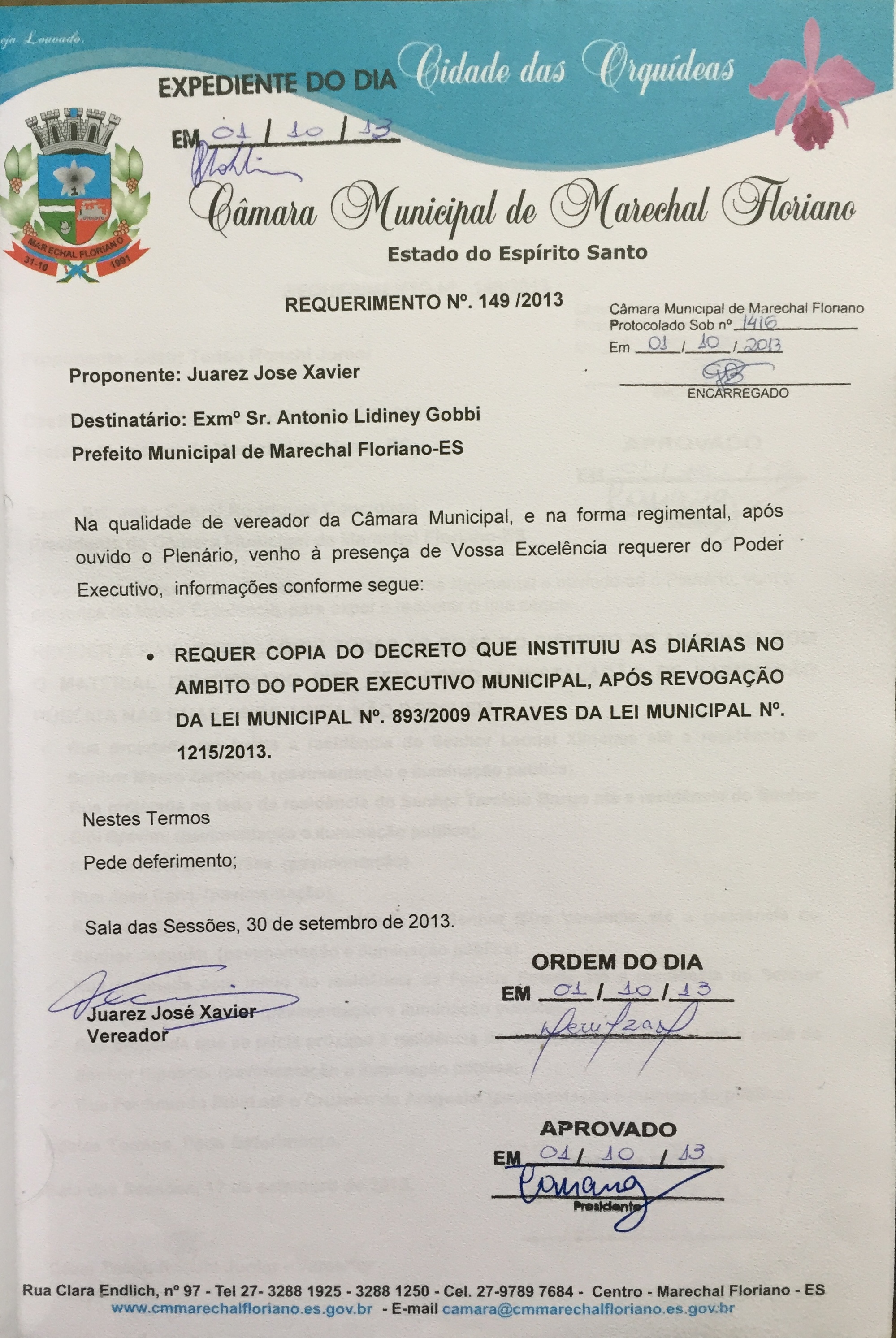Ementa: REQUER COPIA DO DECRETO QUE INSTITUIU AS DIÁRIAS NO ÂMBITO DO PODER EXECUTIVO MUNICIPAL, APÓS REVOGAÇÃO DA LEI MUNICIPAL N°. 893/2009 ATRAVÉS DA LEI MUNICIPAL N°. 1215/2013.
