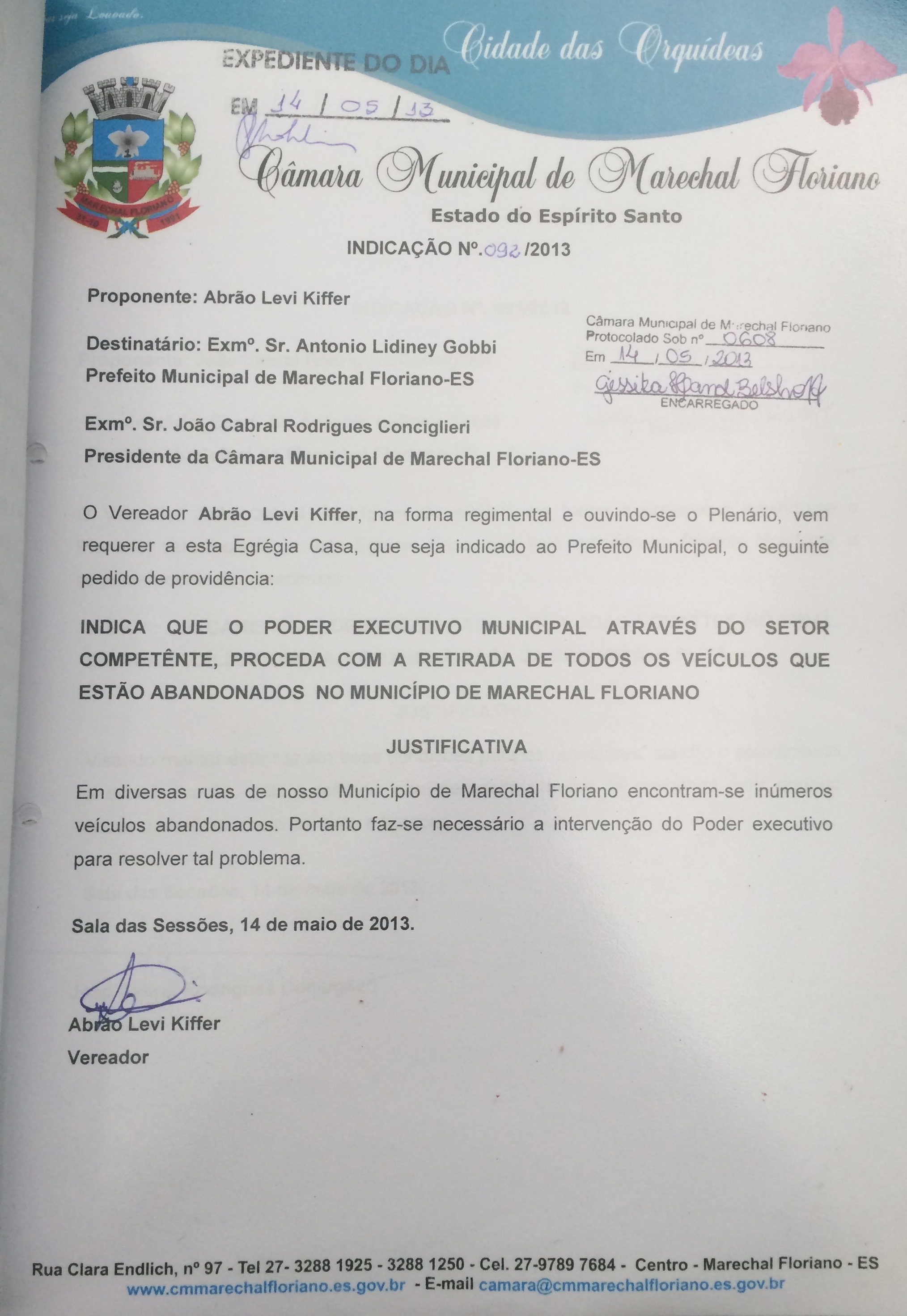 Ementa: INDICA QUE O PODER EXECUTIVO MUNICIPAL ATRAVÉS DO SETOR COMPETENTE, PROCEDA COM A RETIRADA DE TODOS OS VEÍCULOS QUE ESTÃO ABANDONADOS NO MUNICÍPIO DE MARECHAL FLORIANO.