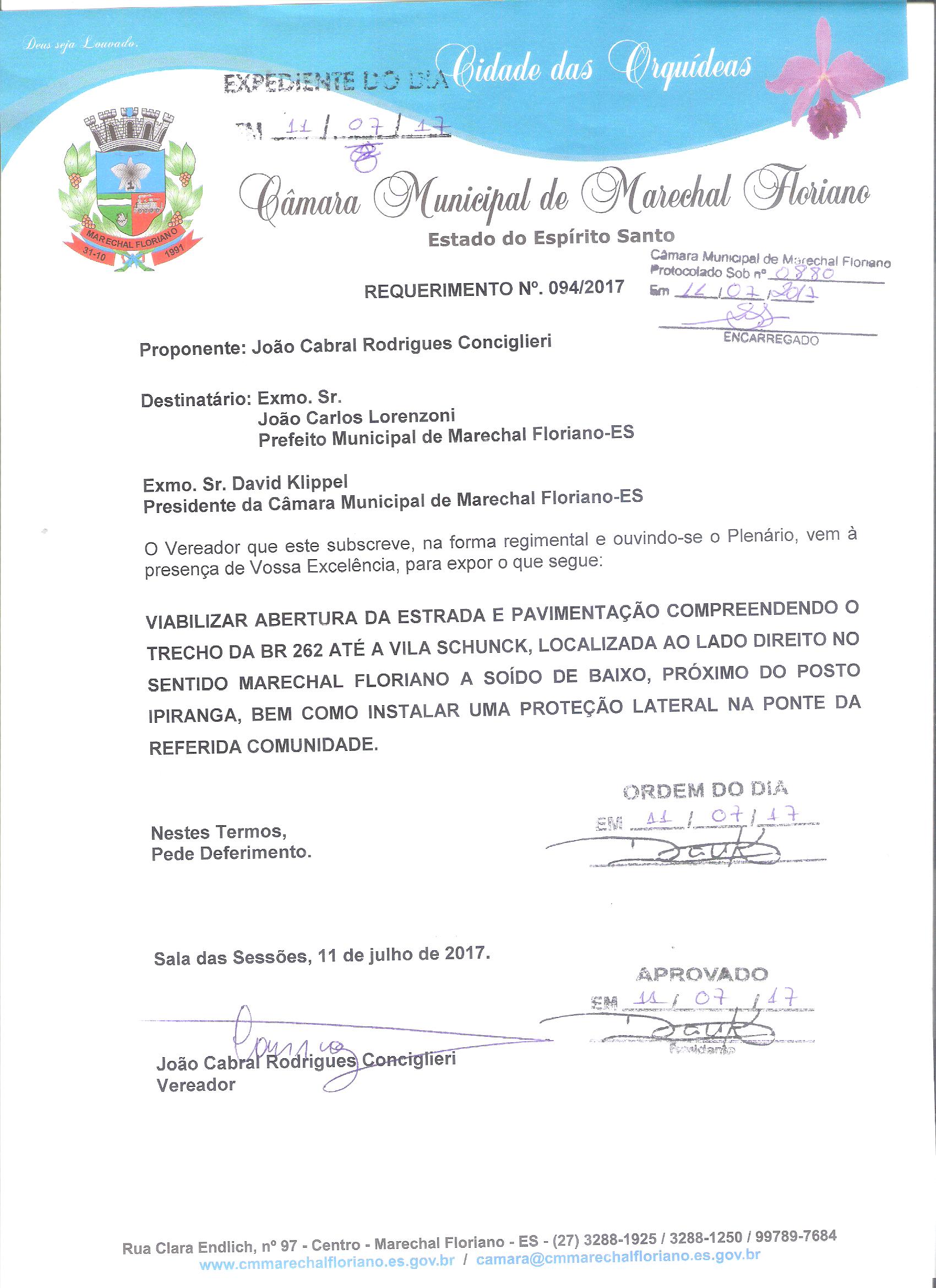 VIABILIZAR ABERTURA DA ESTRADA E PAVIMENTAÇÃO COMPREENDENDO O TRECHO DA BR 262 ATÉ A VILA SCHUNCK, LOCALIZADA AO LADO DIREITO NO SENTIDO MARECHAL FLORIANO A SOÍDO DE BAIXO, PRÓXIMO AO POSTO IPIRANGA, BEM COMO INSTALAR UMA PROTEÇÃO LATERAL NA PONTE DA REFERIDA COMUNIDADE. - - |