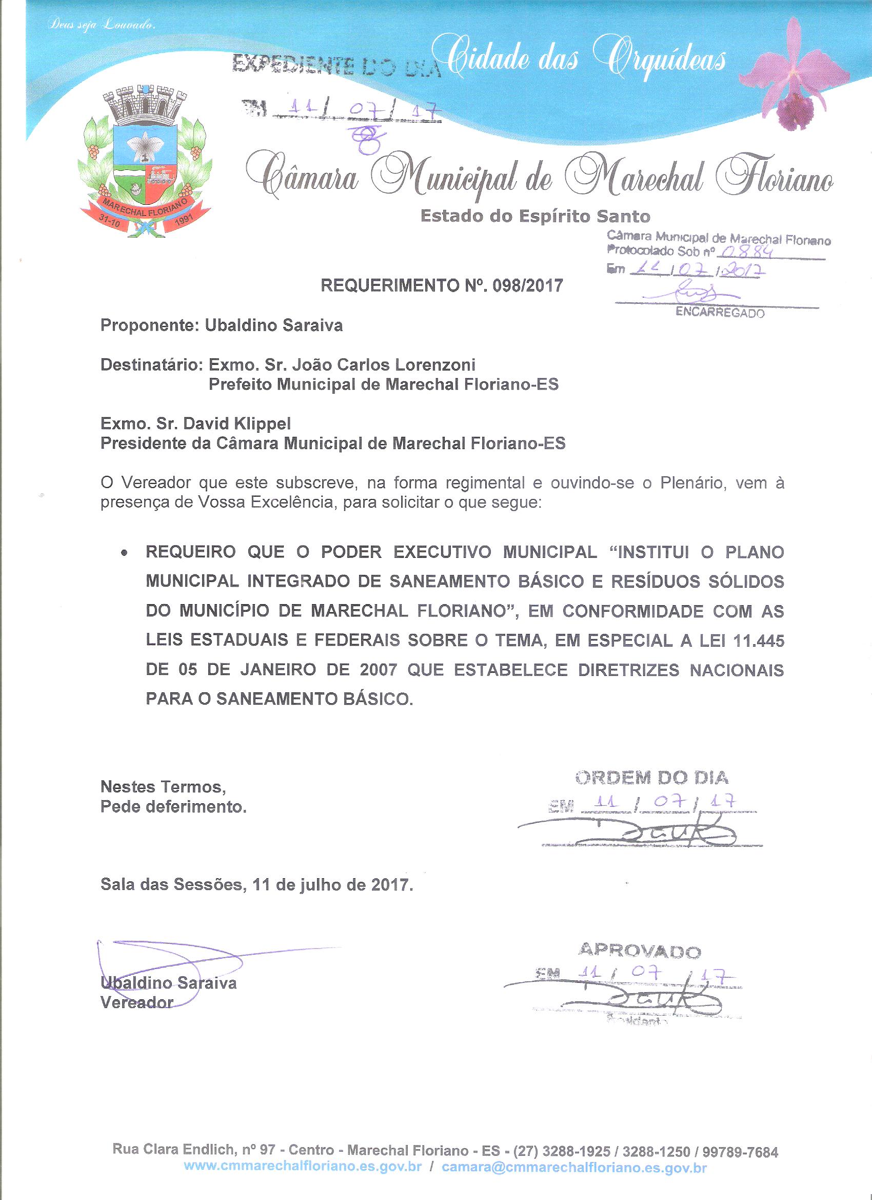 REQUEIRO QUE O PODER EXECUTIVO MUNICIPAL "INSTITUI O PLANO MUNICIPAL INTEGRADO DE SANEAMENTO BÁSICO E RESÍDUOS SÓLIDOS DO MUNICÍPIO DE MARECHAL FLORIANO", EM CONFORMIDADE COM AS LEIS ESTADUAIS E FEDERAIS SOBRE O TEMA, EM ESPECIAL A LEI 11.445 DE 05 DE JANEIRO DE 2007 QUE ESTABELECE DIRETRIZES NACIONAIS PARA O SANEAMENTO BÁSICO. - - |