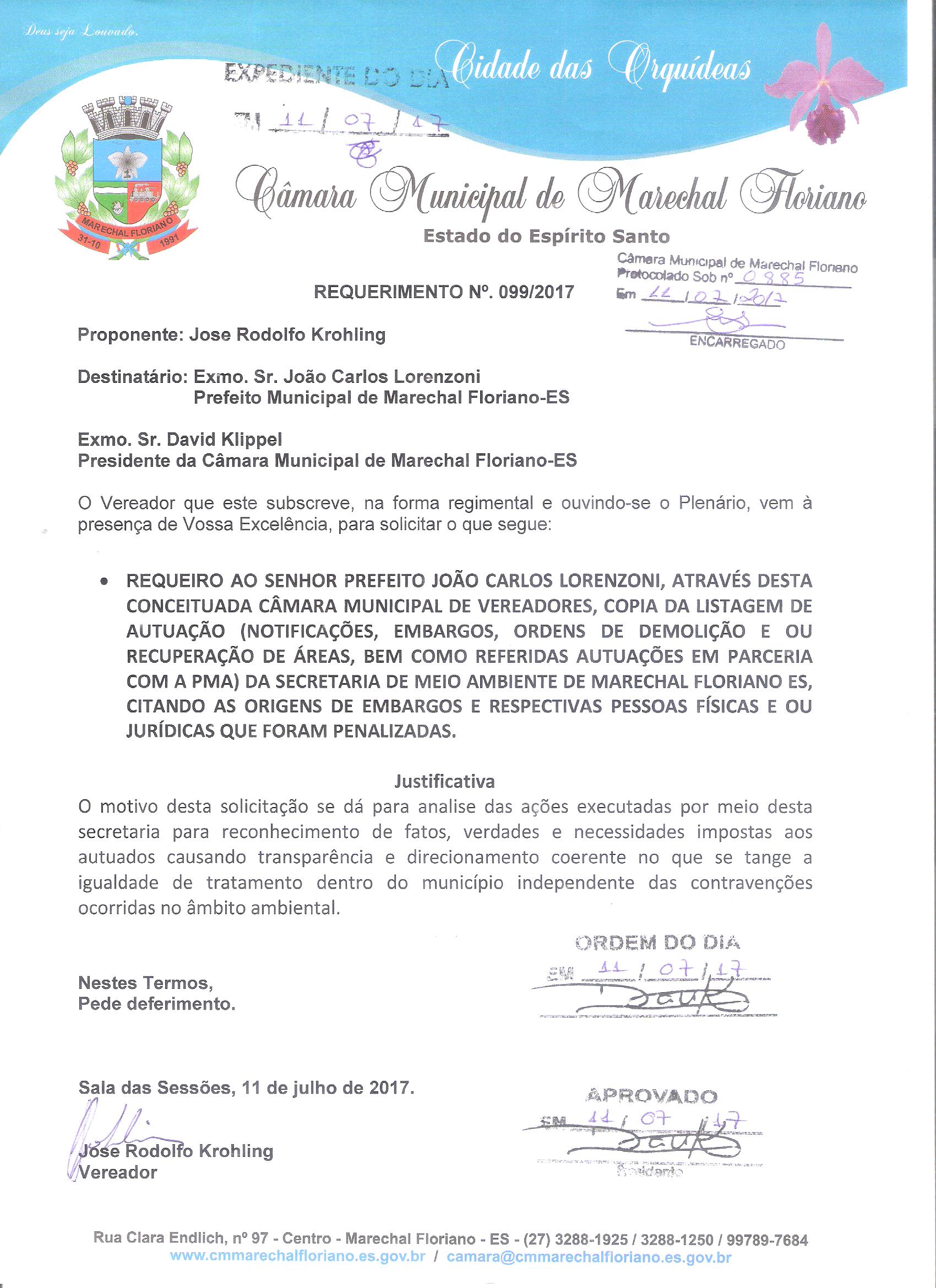 REQUEIRO AO SENHOR PREFEITO JOÃO CARLOS LORENZONI, ATRAVÉS DESTA CONCEITUADA CÂMARA MUNICIPAL DE VEREADORES, COPIA DA LISTAGEM DE AUTUAÇÃO (NOTIFICAÇÕES, EMBARGOS, ORDENS DE DEMOLIÇÃO E OU RECUPERAÇÃO DE ÁREAS, BEM COMO REFERIDAS AUTUAÇÕES EM PARCERIA COM A PMA) DA SECRETARIA DE MEIO AMBIENTE DE MARECHAL FLORIANO ES, CITANDO AS ORIGENS DE EMBARGOS E RESPECTIVAS PESSOAS FÍSICAS E OU JURÍDICAS QUE FORAM PENALIZADAS. - - |