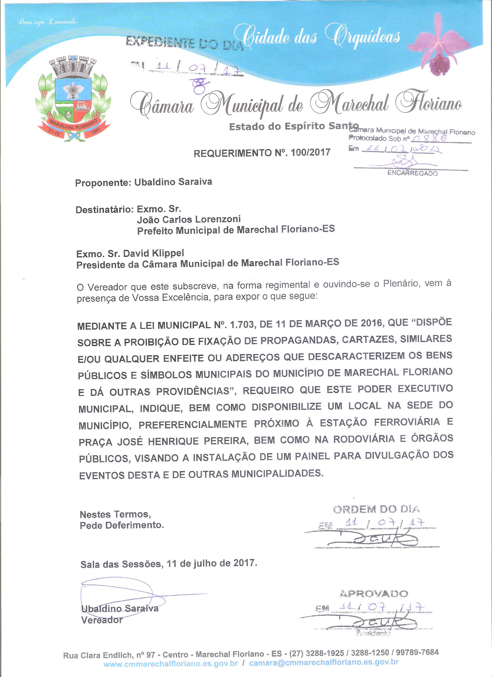 MEDIANTE A LEI MUNICIPAL N°.1.703, DE 11 DE MARÇO DE 2016, QUE "DISPÕE SOBRE A PROIBIÇÃO DE FIXAÇÃO DE PROPAGANDAS, CARTAZES, SIMILARES E/OU QUALQUER ENFEITE OU ADEREÇOS QUE DESCARACTERIZEM OS BENS PÚBLICOS E SÍMBOLOS MUNICIPAIS DO MUNICÍPIO DE MARECHAL FLORIANO E DÁ OUTRAS PROVIDENCIAS", REQUEIRO QUE ESTE PODER EXECUTIVO MUNICIPAL, INDIQUE, BEM COMO DISPONIBILIZE UM LOCAL NA SEDE DO MUNICÍPIO, PREFERENCIALMENTE PRÓXIMO A ESTAÇÃO FERROVIÁRIA E PRAÇA JOSÉ HENRIQUE PEREIRA, BEM COMO NA RODOVIÁRIA E ÓRGÃOS PÚBLICOS, VISANDO INSTALAÇÃO DE UM PAINEL PARA DIVULGAÇÃO DOS EVENTOS DESTA E DE OUTRAS MUNICIPALIDADE. - - |